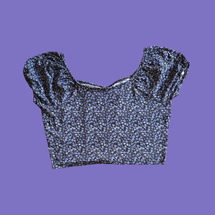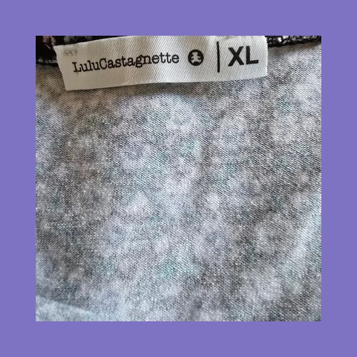 ​• 𝗠𝗮𝗿𝗾𝘂𝗲 : Lulu Castagnette • 𝗧𝘆𝗽𝗲 : Crop Top, Haut court, T-shirt • 𝗦𝘁𝘆𝗹𝗲 : Fleuri, Liberty, Encolure dégagée (col bateau/carré) • 𝗖𝗼𝘂𝗹𝗲𝘂𝗿 : Noir (fond) et Violet/Bleu/Rose (fleurs) • 𝗗𝗲𝘁𝗮𝗶𝗹𝘀 : Manches courtes, pastille ourson métallique. • 𝗠𝗮𝘁𝗶𝗲𝗿𝗲 : 96% viscose, 4% élasthanne • 𝗧𝗮𝗶𝗹𝗹𝗲 : 42 (XL) • 𝗘𝘁𝗮𝘁 : Très bon état