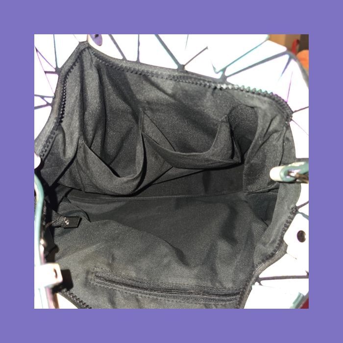 • ​𝗧𝘆𝗽𝗲 : Sac à main / Sac fourre-tout (Tote Bag) / Sac Bandoulière • ​𝗦𝘁𝘆𝗹𝗲 : Géométrique / Holographique / Réfléchissant / Iridescent • ​𝗖𝗼𝘂𝗹𝗲𝘂𝗿 𝗲𝘅𝘁𝗲𝗿𝗶𝗲𝘂𝗿𝗲 : Gris anthracite (sans lumière) / Multicolore (avec lumière) • ​𝗖𝗼𝘂𝗹𝗲𝘂𝗿 𝗶𝗻𝘁𝗲𝗿𝗶𝗲𝘂𝗿𝗲 : Noir • ​𝗣𝗼𝗿𝘁𝗲́ : Main (anses courtes) ou Épaule/Croisé (bandoulière amovible et réglable) • ​𝗙𝗲𝗿𝗺𝗲𝘁𝘂𝗿𝗲 : Zippée • ​𝗜𝗻𝘁𝗲́𝗿𝗶𝗲𝘂𝗿 : 1 poche zippée, 2 poches ouvertes. • ​𝗗𝗶𝗺𝗲𝗻𝘀𝗶𝗼𝗻𝘀 : 35 x 13 x 29 cm • ​𝗘𝘁𝗮𝘁 : Très bon état. Mise a part un coup de dents de mon lapin sur la bandoulière au niveau d'une couture. Voir photo n°5.