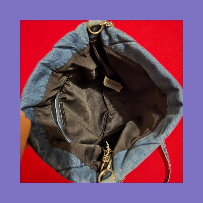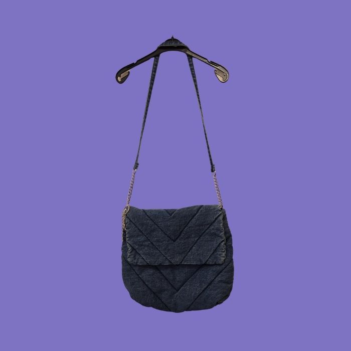 • 𝗠𝗮𝗿𝗾𝘂𝗲 : Calliope • 𝗧𝘆𝗽𝗲 : Sac bandoulière, Sac à main • 𝗠𝗮𝘁𝗶𝗲𝗿𝗲 : Jean matelassé (95% Coton, 5% Polyester), Doublure 100% Polyester • 𝗖𝗼𝘂𝗹𝗲𝘂𝗿 : Jean bleu denim délavé • 𝗗𝗲𝘁𝗮𝗶𝗹𝘀 : Matelassage chevron, bandoulière chaîne dorée, pendentifs décoratifs (cœur strass, Tour Eiffel, lettre S strass). • 𝗦𝘁𝘆𝗹𝗲 : Chic décontracté, Urbain, Tendance, Parisien • 𝗗𝗶𝗺𝗲𝗻𝘀𝗶𝗼𝗻𝘀 : 35 x 15 x 30 cm • 𝗘𝘁𝗮𝘁 : Très Bon état
