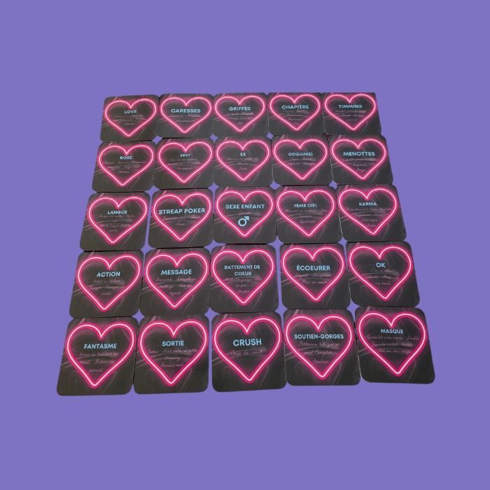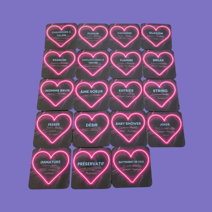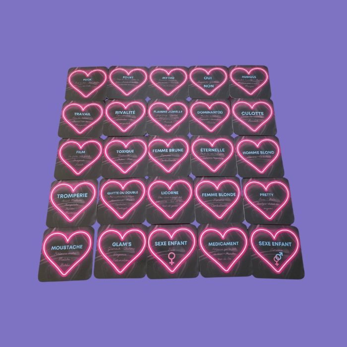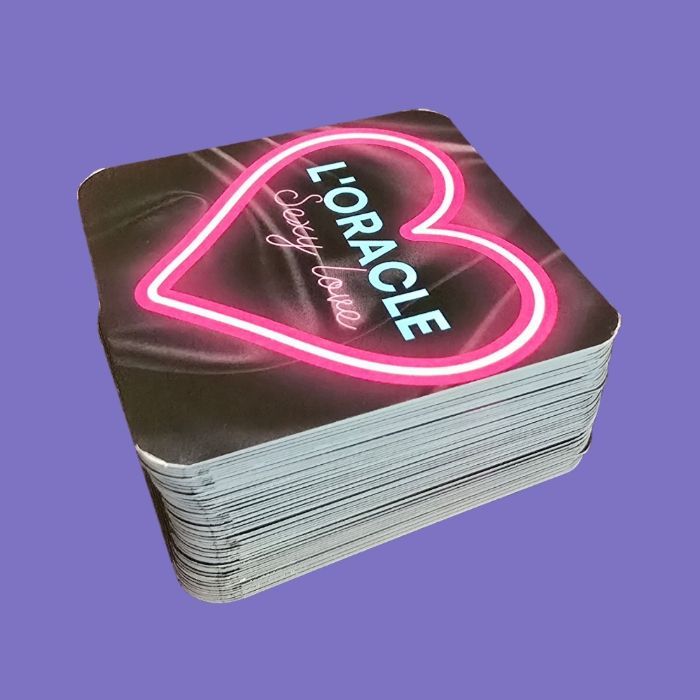 Oracle sentimental. Taille 6,5 x 6,5 cm, pelliculage brillant, 69 cartes, pas de livret des mots clés directement sur les cartes. Auto édité, conçu et imprimé en France.