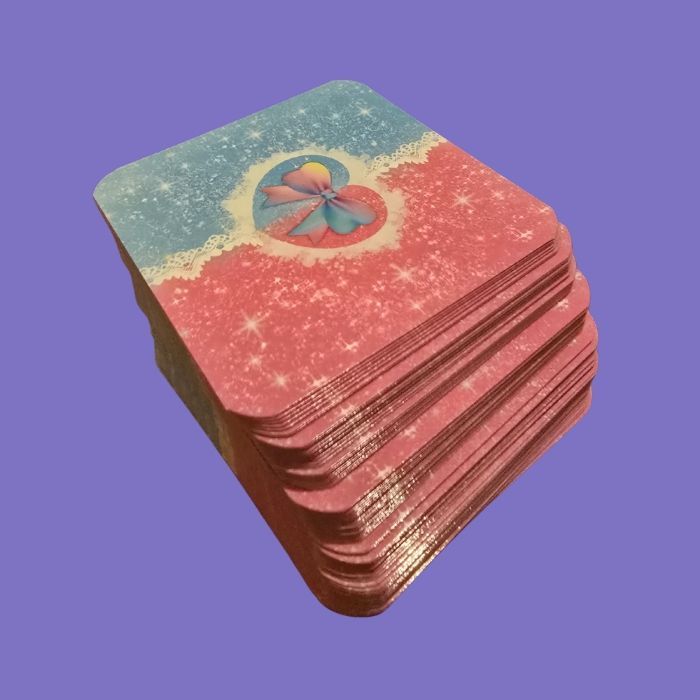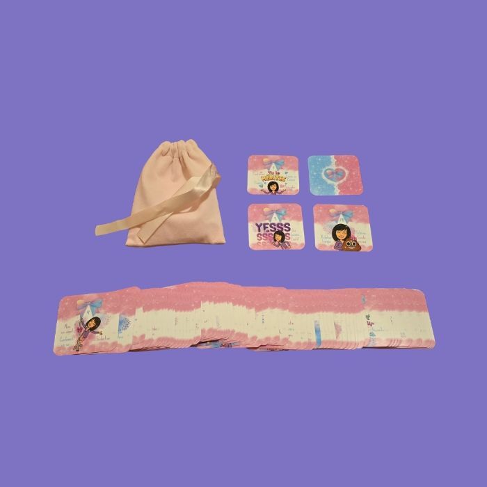 Découvrez l'oracle sentimental sweety et funny de DÉA SACRÉE ! Taille 6,5 x 6,5 cm, pelliculage brillant, 78 cartes, pas de livret, les mots clés sont directement sur les cartes et les images sont très parlantes. Pochette en velours rose. Auto-édition, conçu et imprimé en France. ISBN : 978-2-9582231-3-7