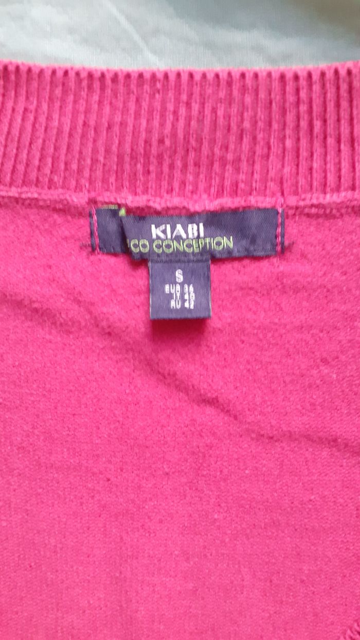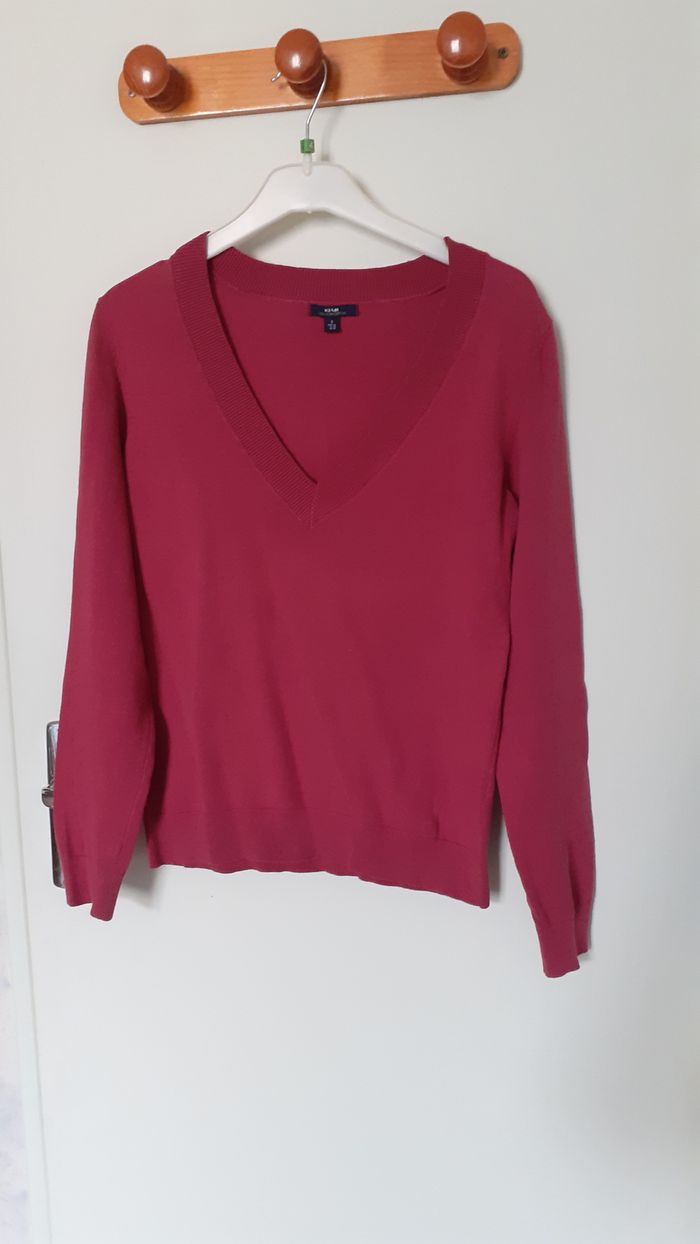 Vends un pull en maille fin, manches longues, court, décolleté en V profond, couleur bordeaux clair, marque Kiabi écoconception, taille S. Longueur sous aisselle : 39 cm.