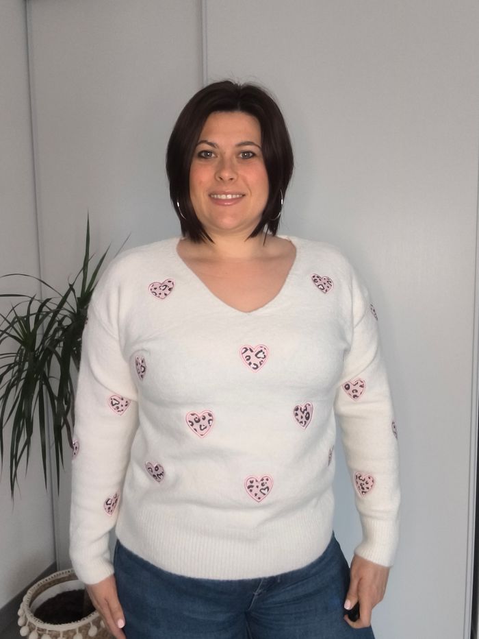 Nouvelle collection 🎉 Pull écru avec des coeurs léopard rose Taille unique 36-42