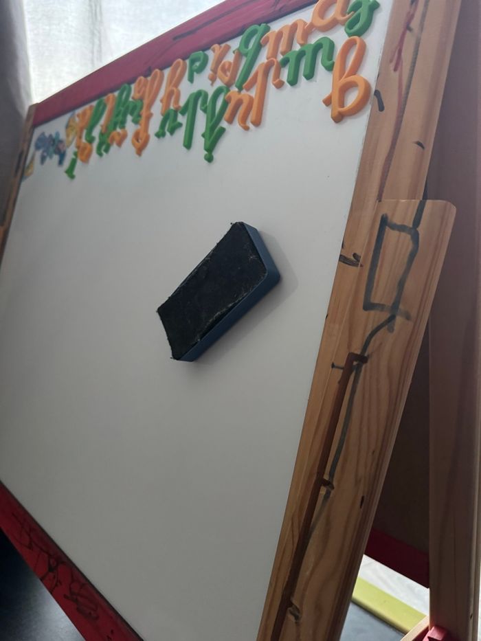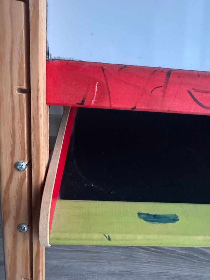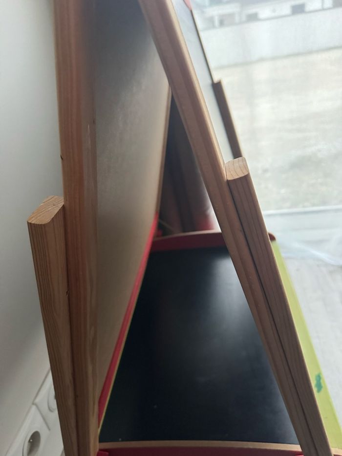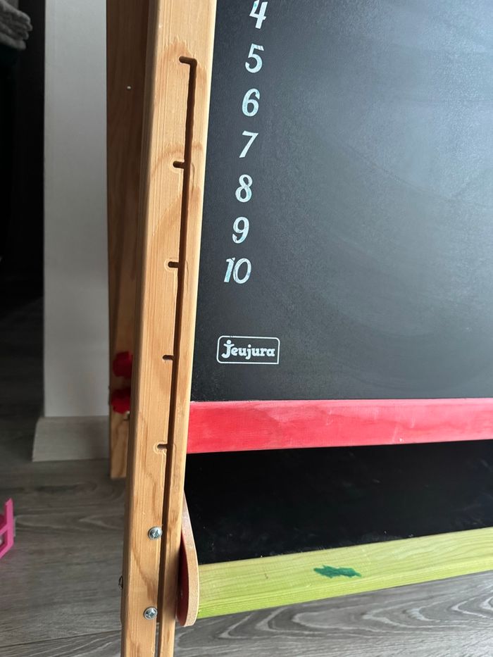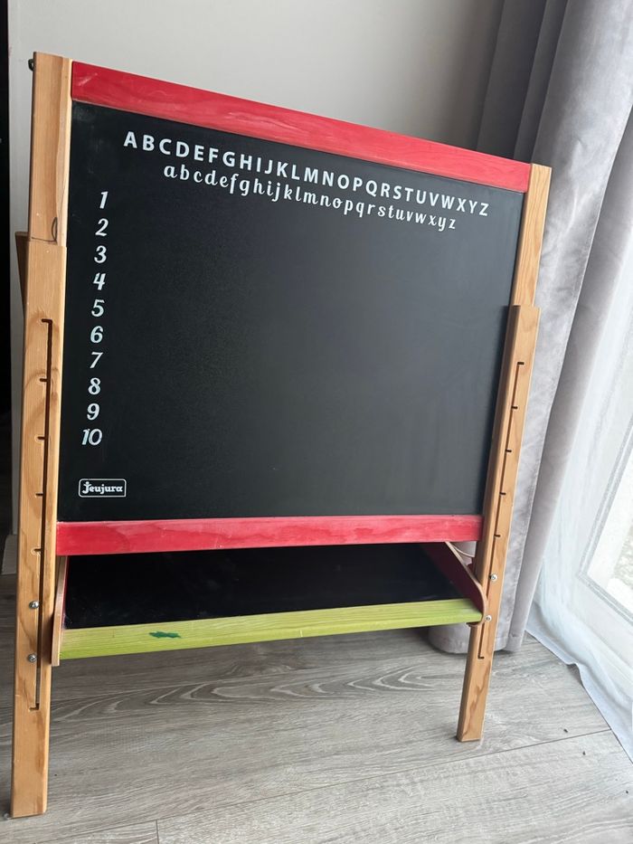 Grand Tableau Multifonctions en bois : deux grandes ardoises: une face ardoise pour écrire à la craie, une face blanche magnétique pour feutre effaçable à sec et lettres aimantées - Tablette de rangement - Le tableau se replie facilement, pratique pour le rangement ! - Les pieds sont très facilement ajustables en hauteur (de 80 à 120 cm), le tableau grandit avec l'enfant partir de 3 ans Bon état : feutre présents sur le bois