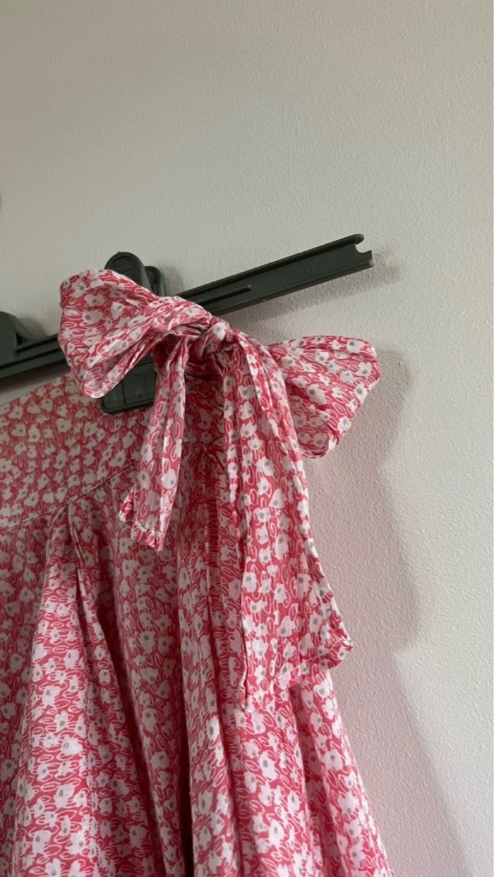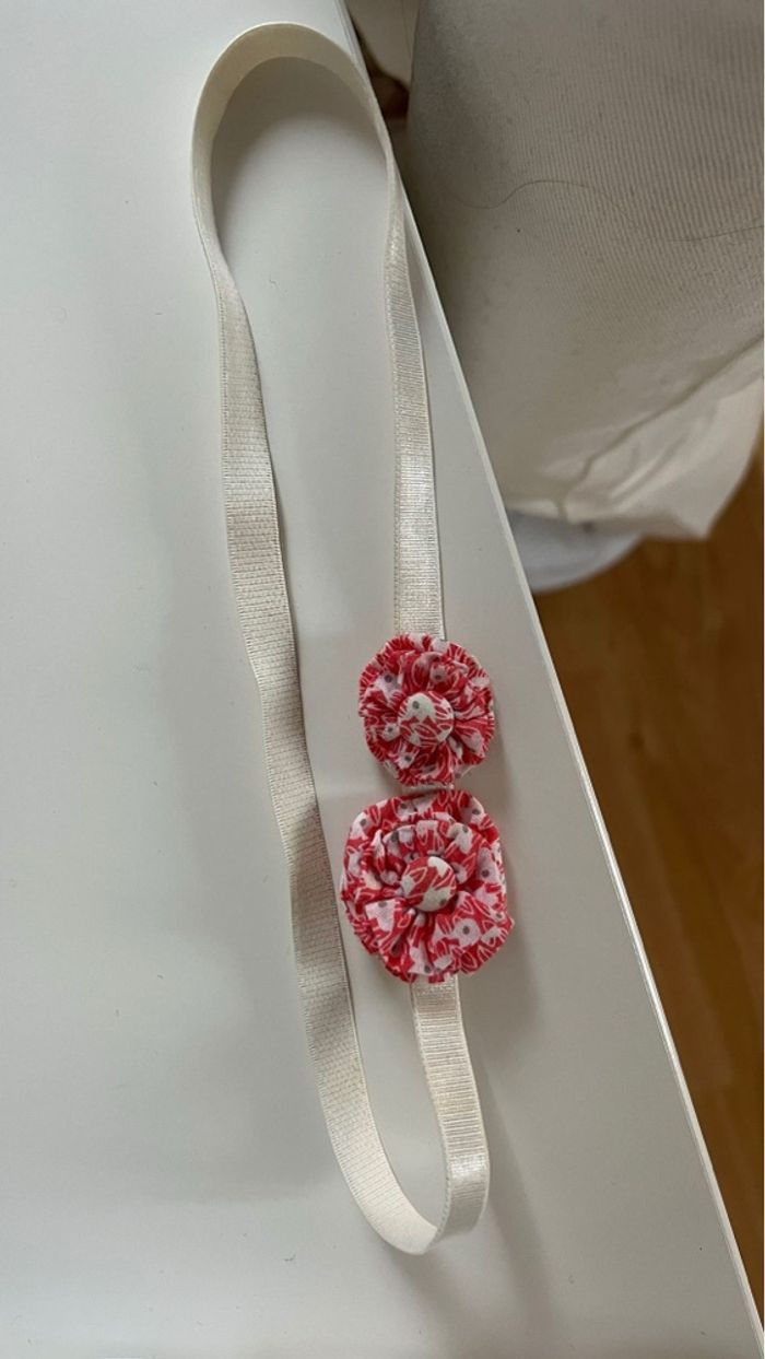 Jupe rose à fleurs blanches de la marque Tape à l’œil, zip pour fermer sur le côté et nœud décoratif, serre-tête compris, très peu porté, taille correctement