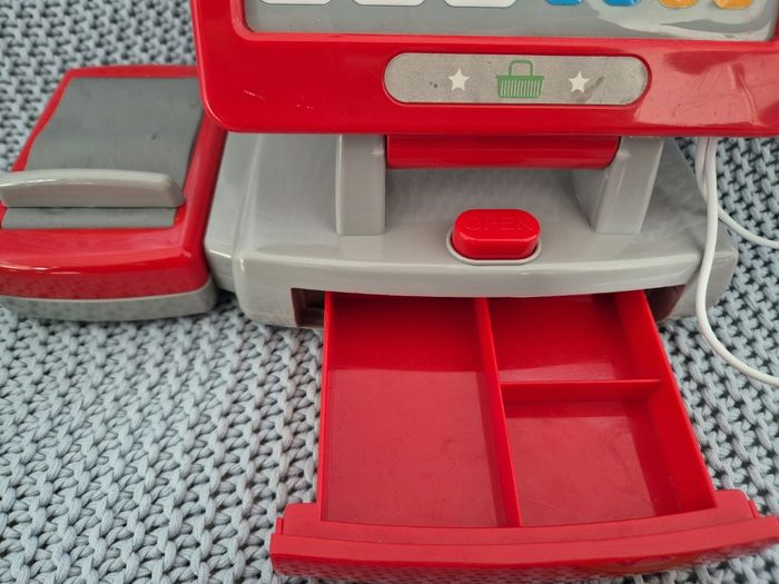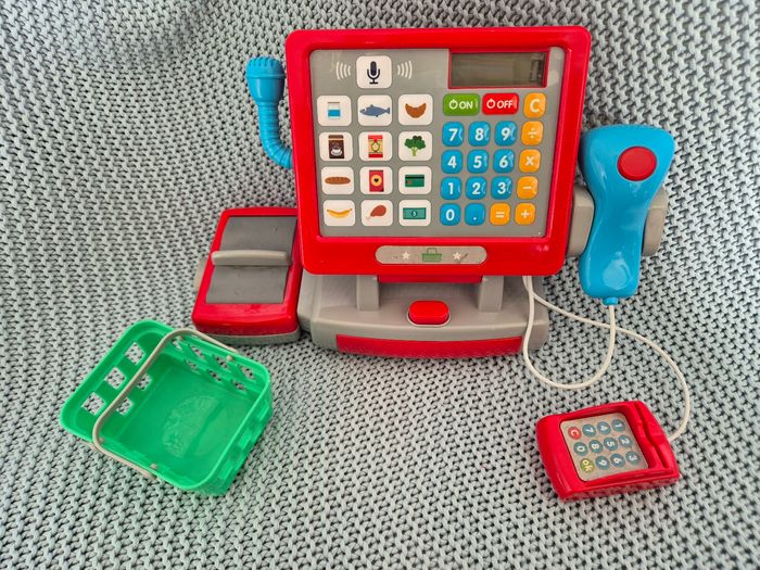 Caisse enregistreuse avec son et lumière + petit panier. Quelques traces d'usure sur autocollant et tapis roulant, mais reste encore en bon état. #mimidacenfant #mimidacjouets