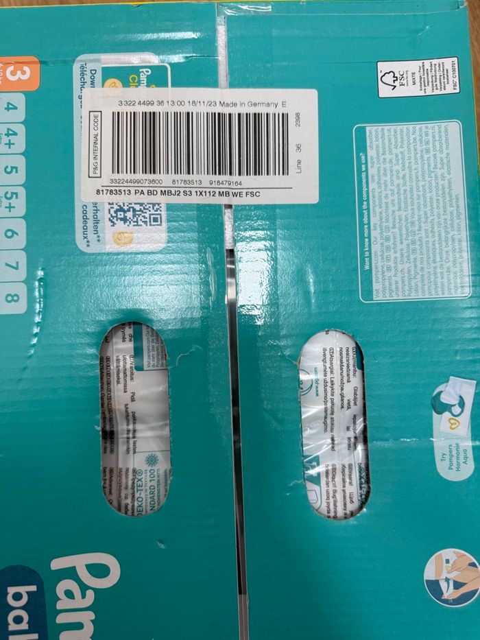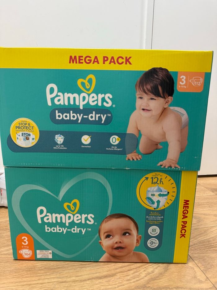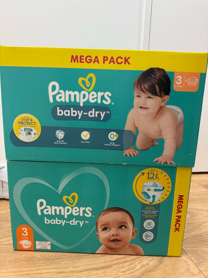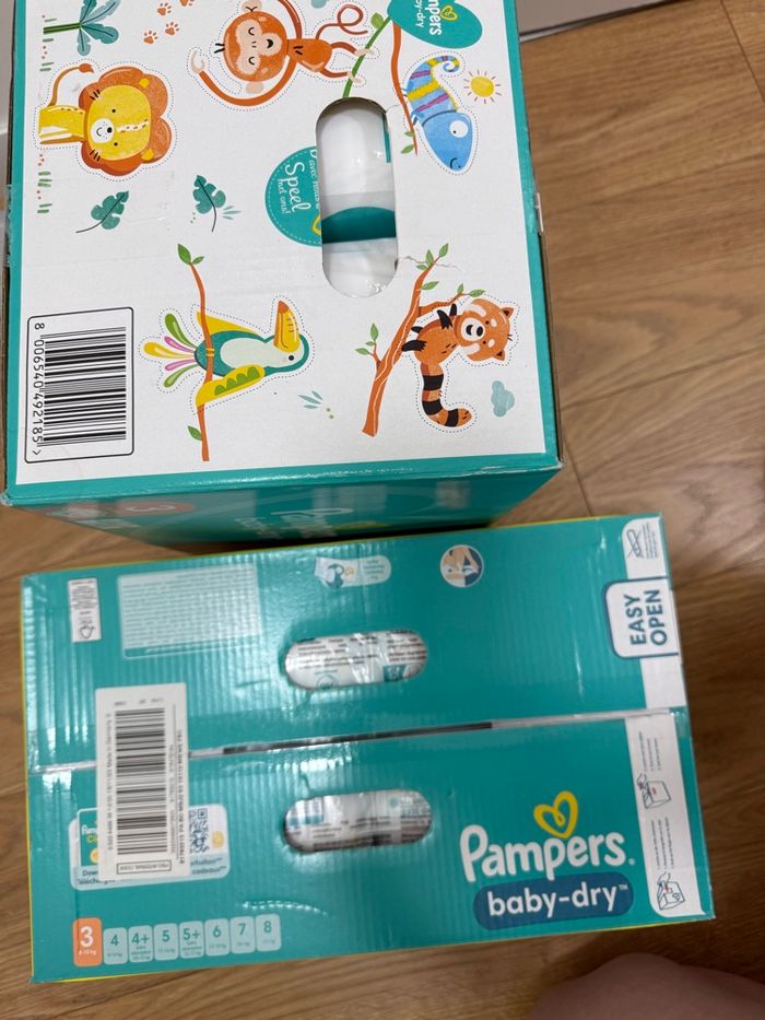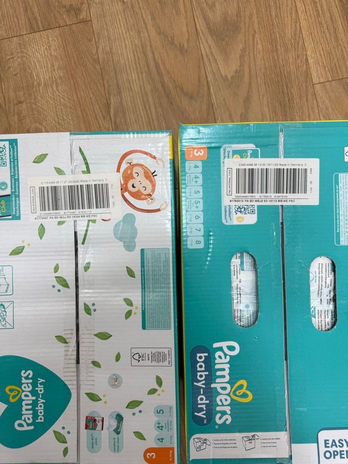 2 cartons de couches dont 1 de 104 couches et 1 de 112 couches tailles 3 Jamais ouvert mais pour l’envoi je vais devoir l’ouvrir pour mettre dans 1 seul colis