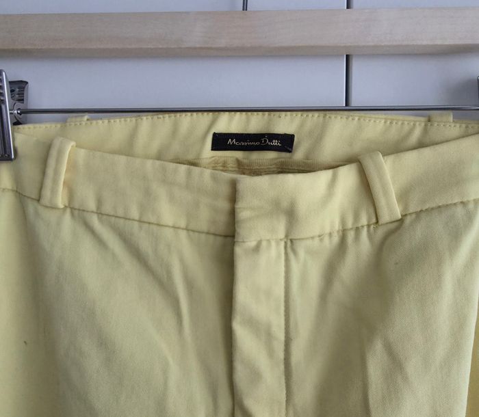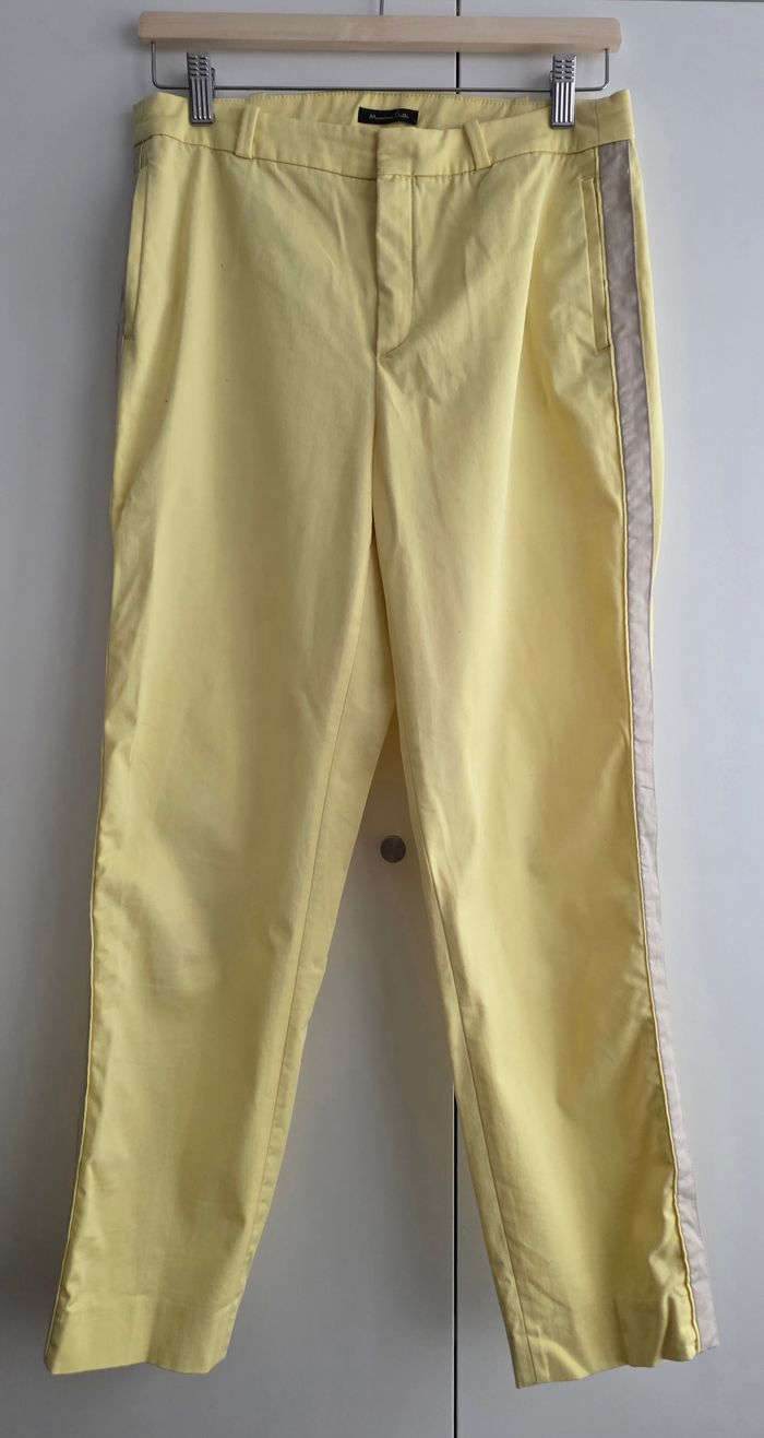 Pantalon de marque Massimo Dutti, taille 40, 62% coton, 28% lyocell, 8% elastomultiester, 2% élasthanne. Couleur jaune, bande grise sur les cotés. 2 poches avant, 2 fausses poches arrière, passant pour ceinture. Mesure taille: 38cm Entrejambe: 69cm Longueur: 92cm