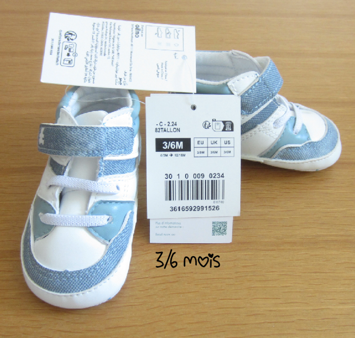 Chaussures pour bébé. Se ferme avec un scratch. Tiennent bien aux petits pieds. Neuves car recues en double. Marque Gémo.