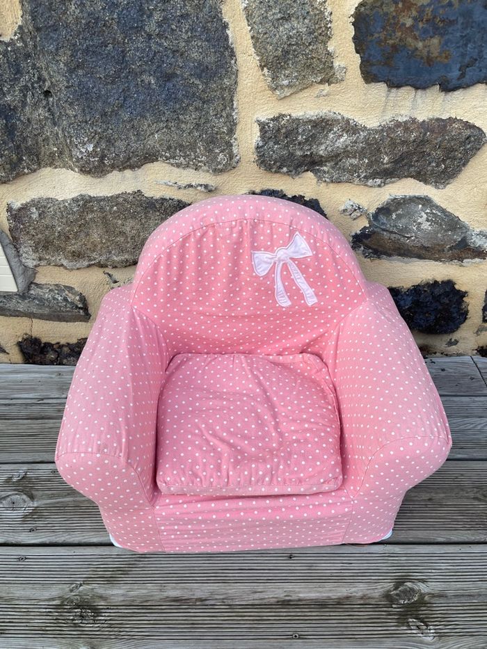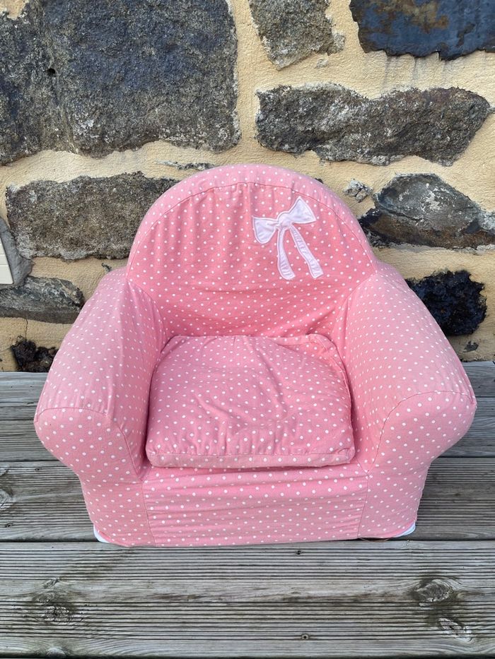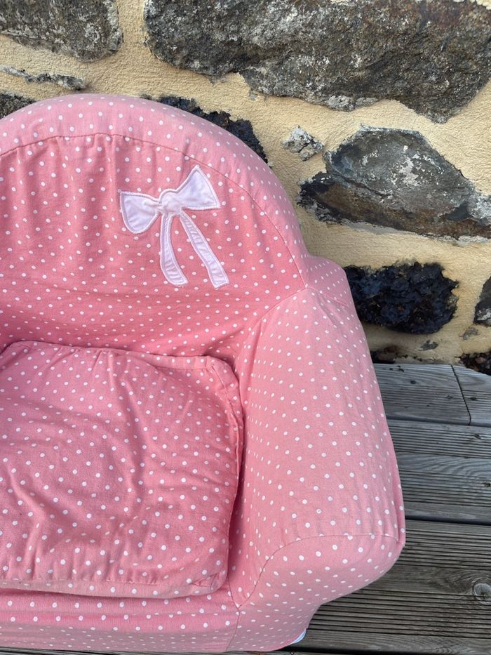 Fauteuil enfant Rose à pois blanc Vertbaudet Très bonne état viens d’être laver Juste le dessous du fauteuil un peu abîmer