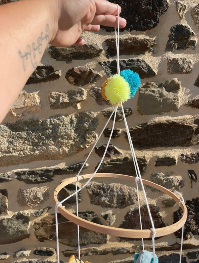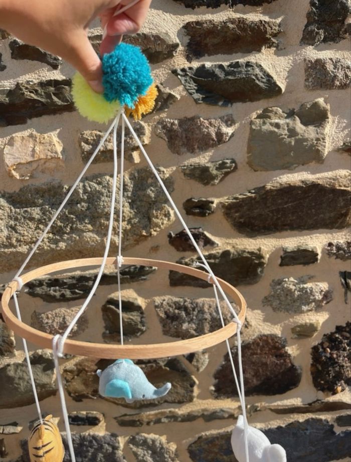 Mobile non musical avec cerceau en bois et petits pompons colorés. Theme "crazy jungle" Dès la naissance. Fixation sur lit à barreaux. Dimensions : 65 cm (hauteur) Composition : 100% polyester. Rembourrage 100% polyester. Poids : 0.668 kg Premaman - Orchestra