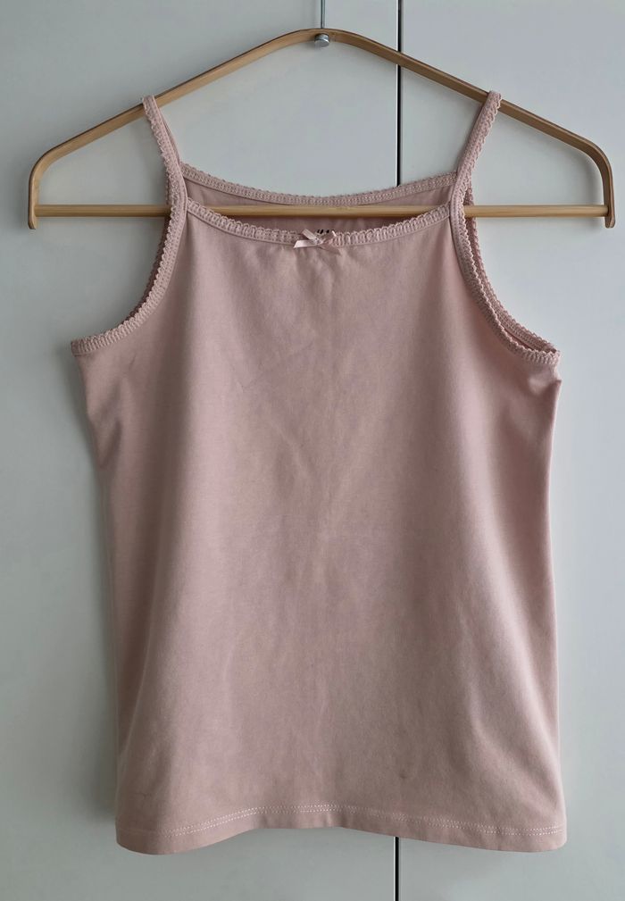 Débardeur de marque H&M, taille 10 ans, 95% coton, 5% élasthanne. Couleur rose pale, noeud déco sous col.