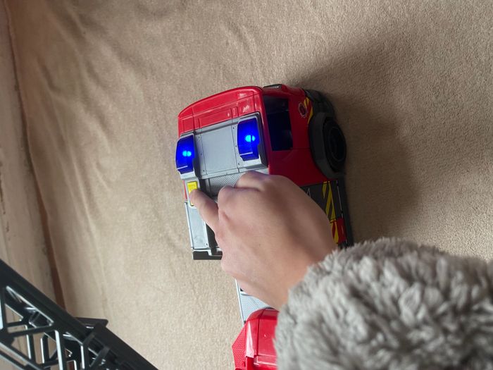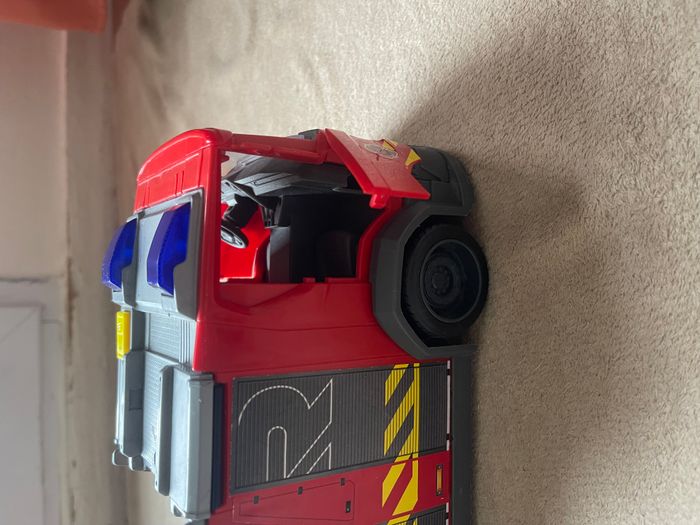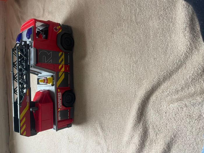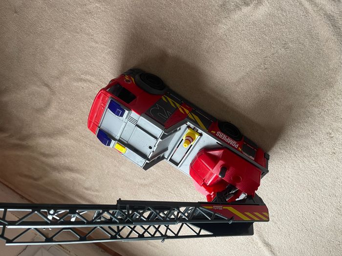 Jeux camion de pompier environ 30cm Échelle qui se met en hauteur 1 plot Sirène girophare fonctionne très bien Autocollant légèrement enlever à certain endroit