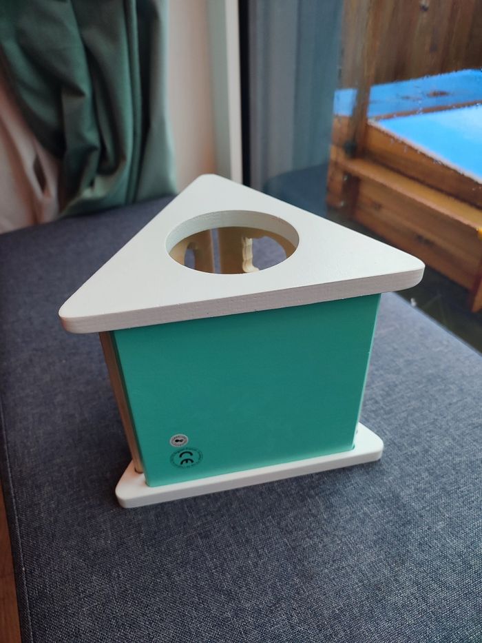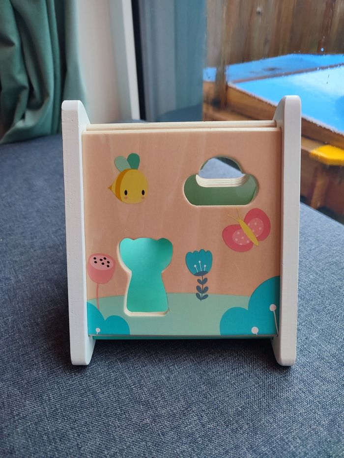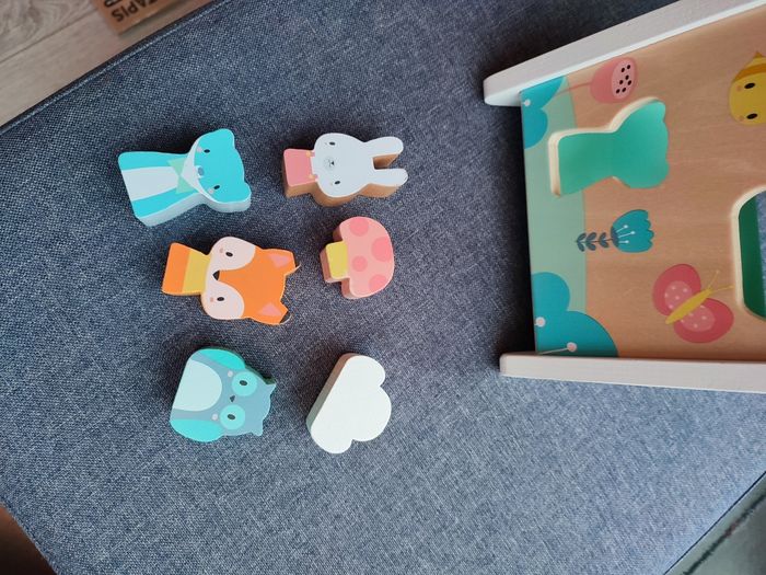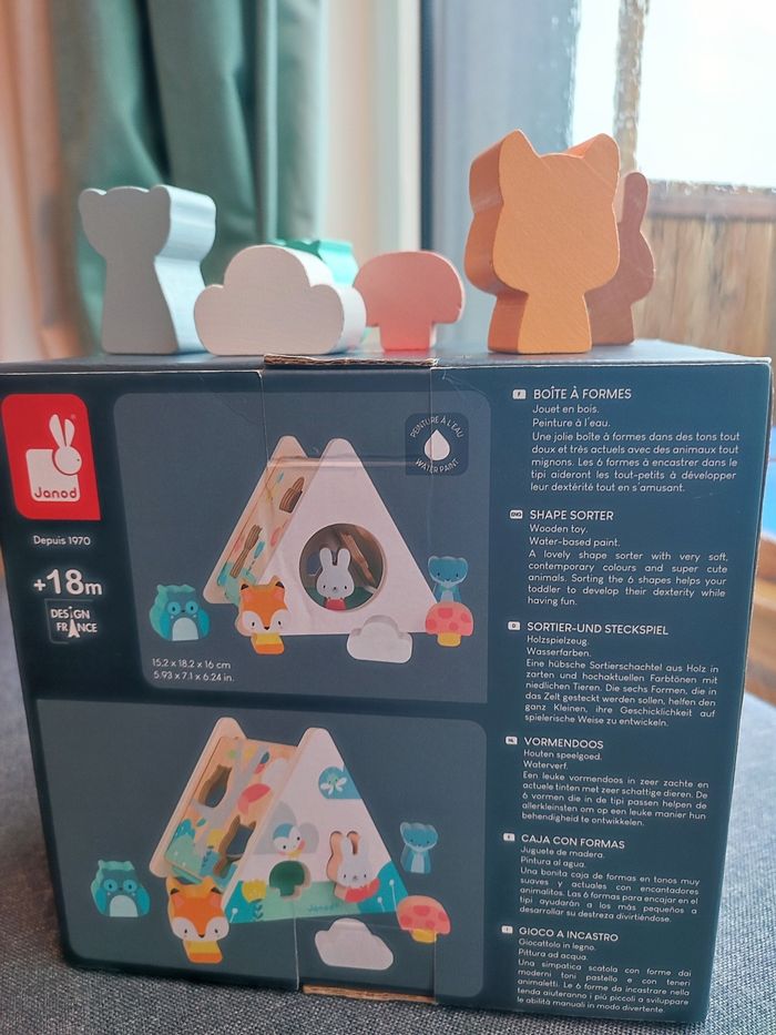 Bonjour, je vends cette boîte à formes sur le thème des animaux de la forêt pour 18 mois et plus (mon fils à commencé à jouer avec à 12 mois). A 12 mois, le bébé mettra les formes dans le grand rond sur le côté puis petit à petit il commencera à mettre les animaux dans les formes qui correspondent. Idéal pour développer la logique et la préhension de votre bébé. Très bon état mais peinture un peu abîmée sur l'un des côtés de la boîte et sur le côté de l'un des personnes (voir photos).