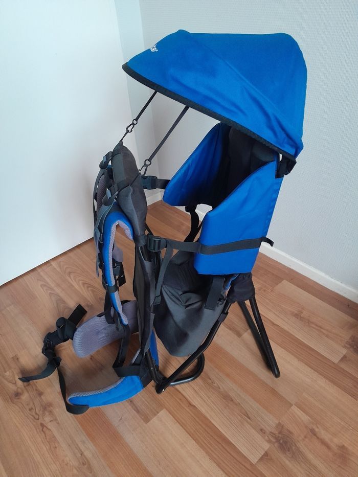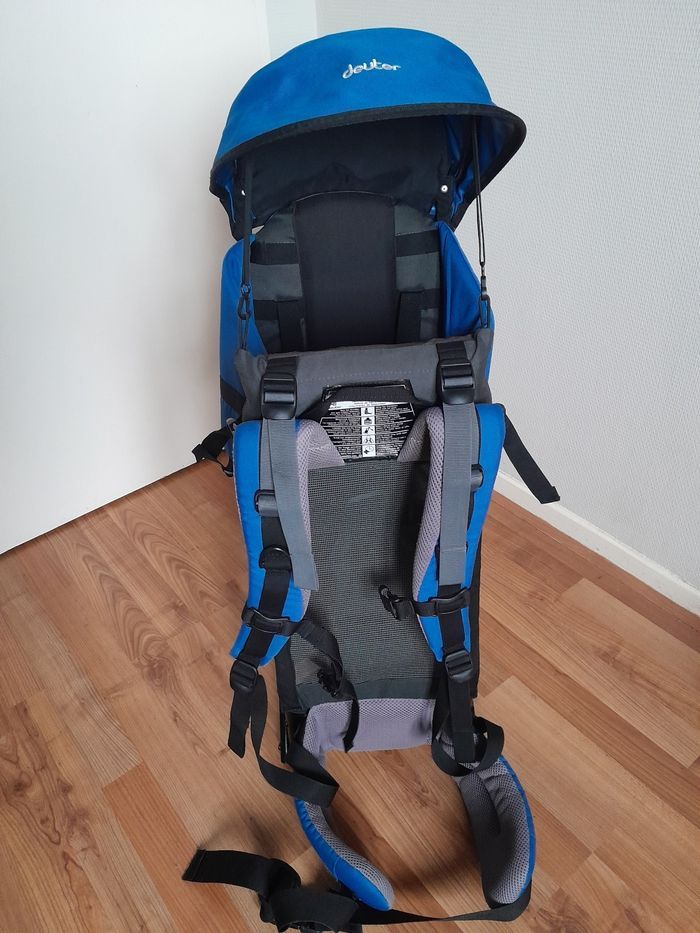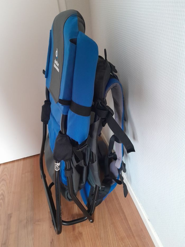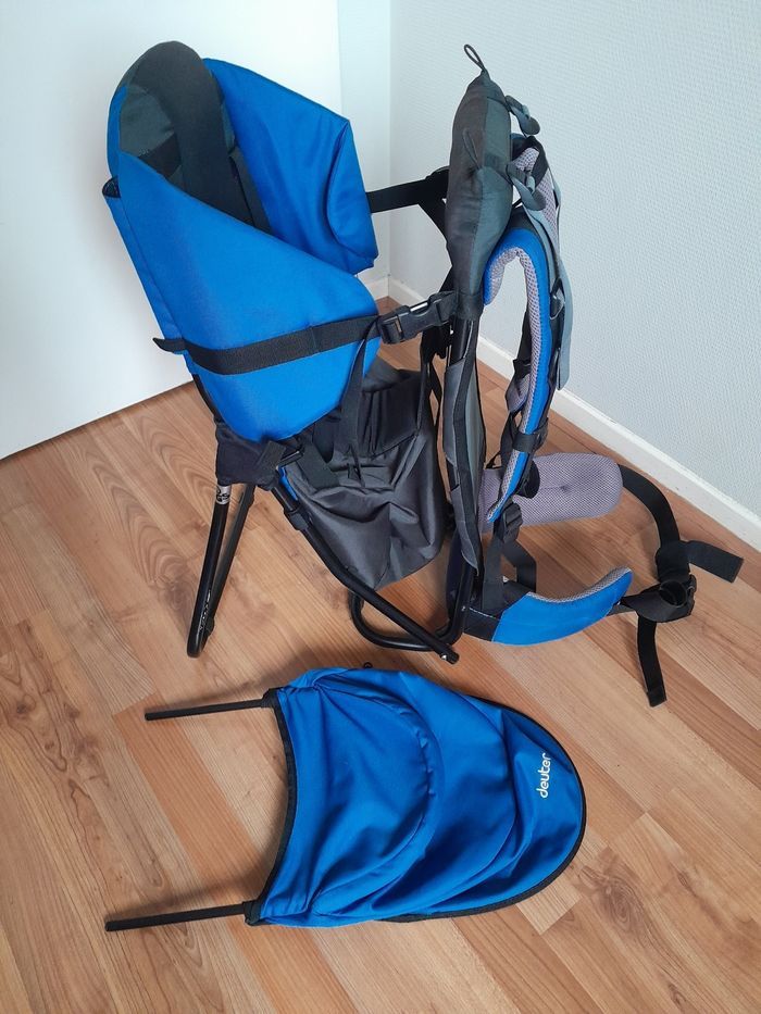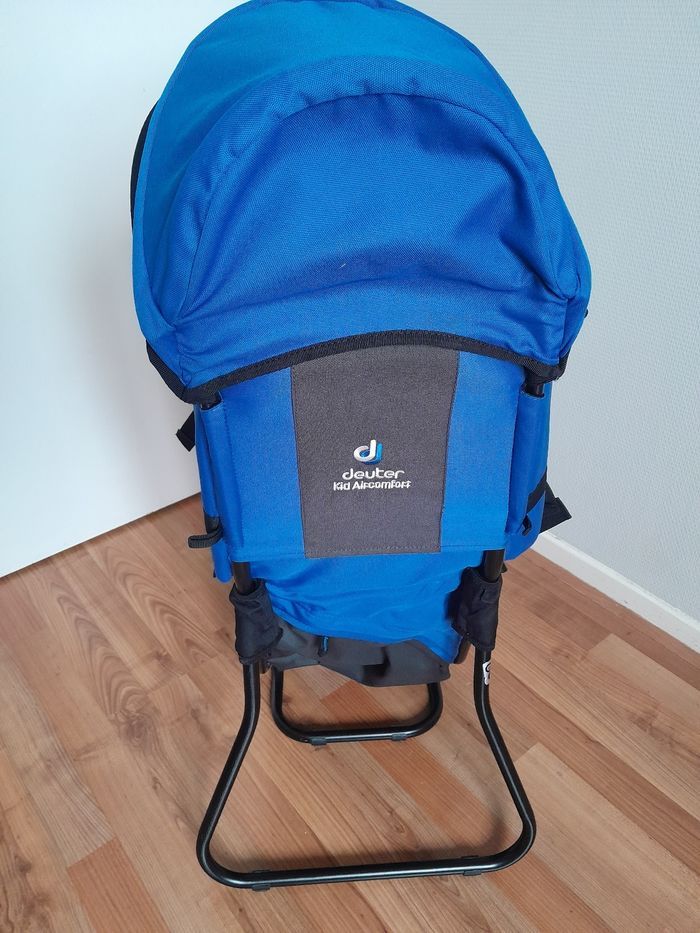 Porte bébé kid air comfort en parfait état. Couleur bleu , vendu avec son pare soleil. Poids de charge de portage jusqu'à 22 kilos. Bretelles rembourees. Housse lavable et.pied amovible pour le maintenir debout. Marque deuter solide et durable dans le temps.