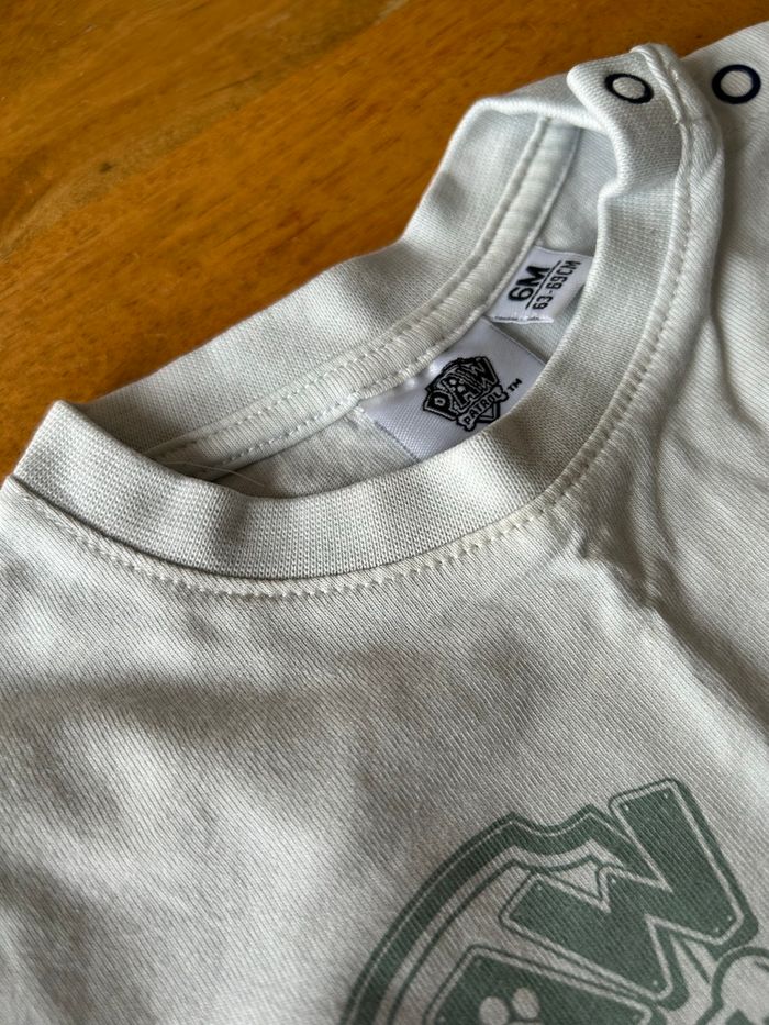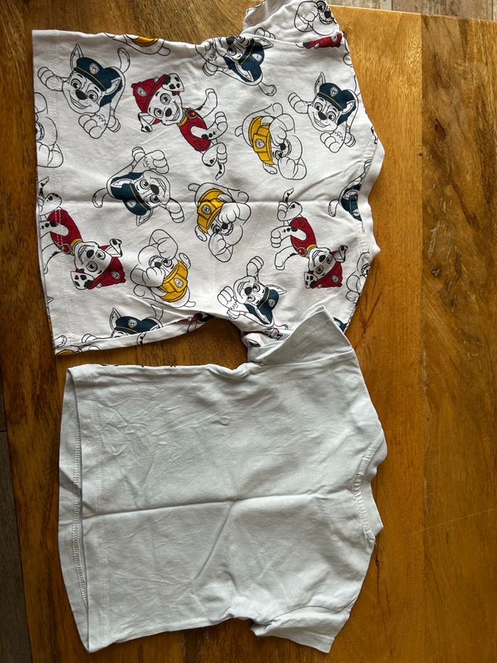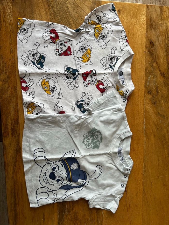 2 t-shirt Paw Patrol en taille 6 mois Le t-shirt avec Chase n’est plus aussi blanc mais pas de tache particulière L’autre t-shirt est en bon état