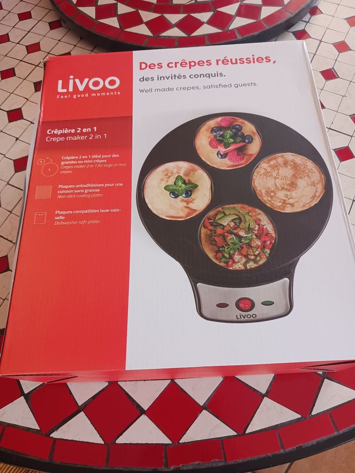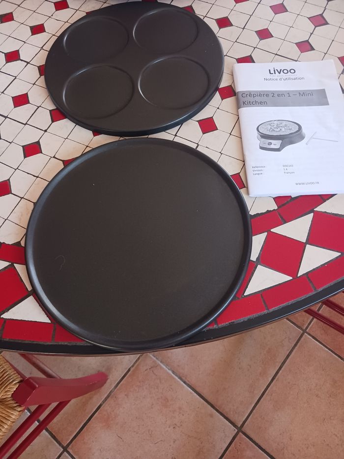 Crépiere avec plaque adhésive comportant 2 plateaux permettant de réaliser des grandes crêpes mais aussi des mini pour les enfants. Passe au lave-vaisselle. Très peu utilisé