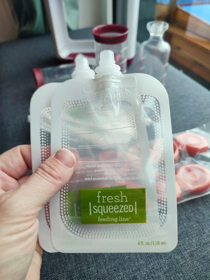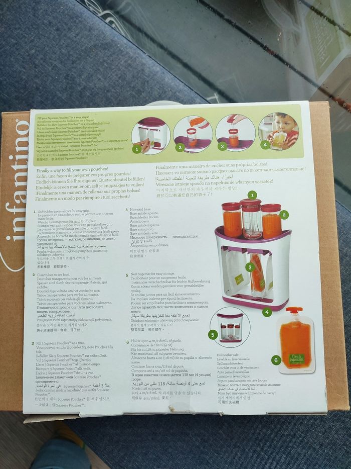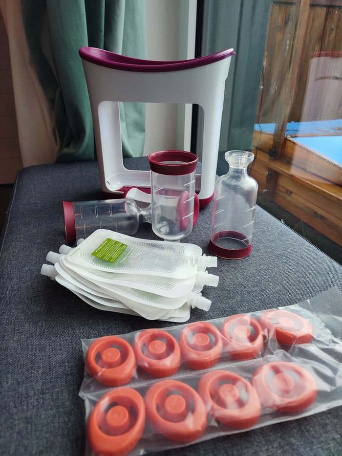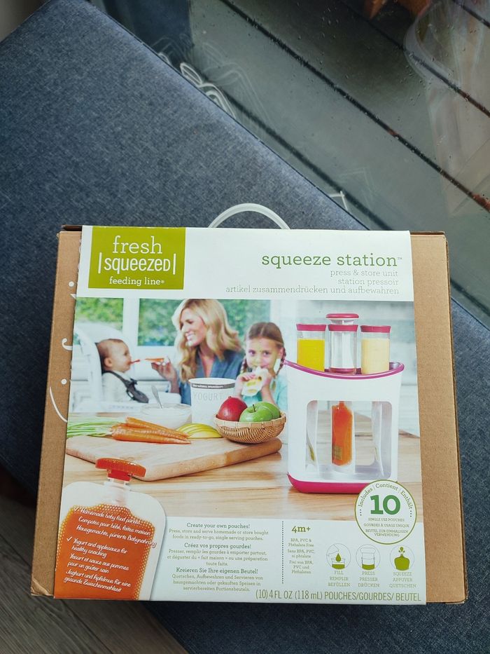 Utilisé une seule fois. Cette station vous permet de composer vous mêmes les gourdes pour vos enfants. Grâce à elle, vous savez ce que vos enfants mangent, des produits faits maison, des compotes, des soupes, des plats moulinés... Des gourdes beaucoup moins chères que celles vendues en grandes surfaces. Surtout quand vos enfants sont fan de pompotes ! Je m'en sépare car mon fils n'a jamais aimé utiliser le système de gourdes. Le kit contient 9 gourdes et 9 bouchons au lieu de 10. Le reste est complet et en excellent état. Vendu dans la boîte d'origine.