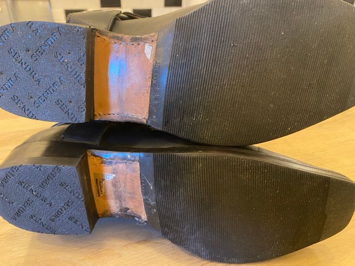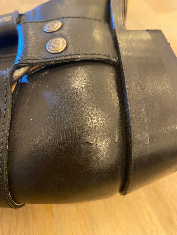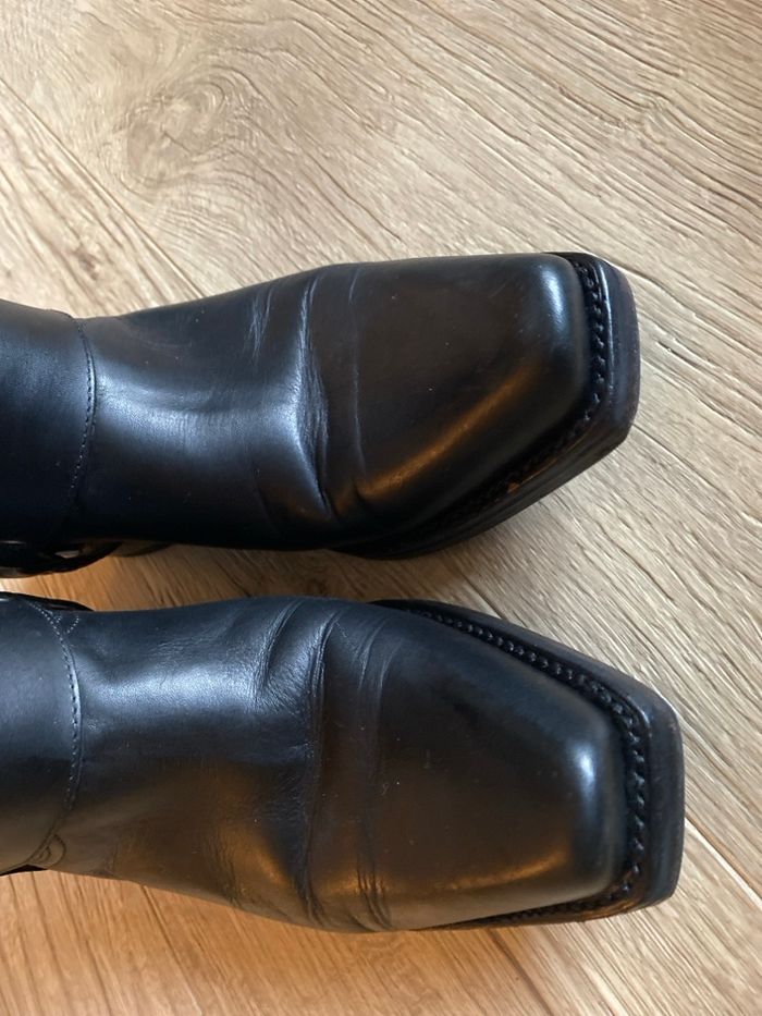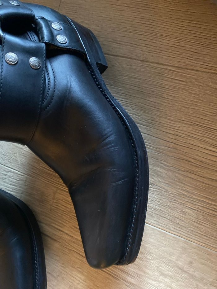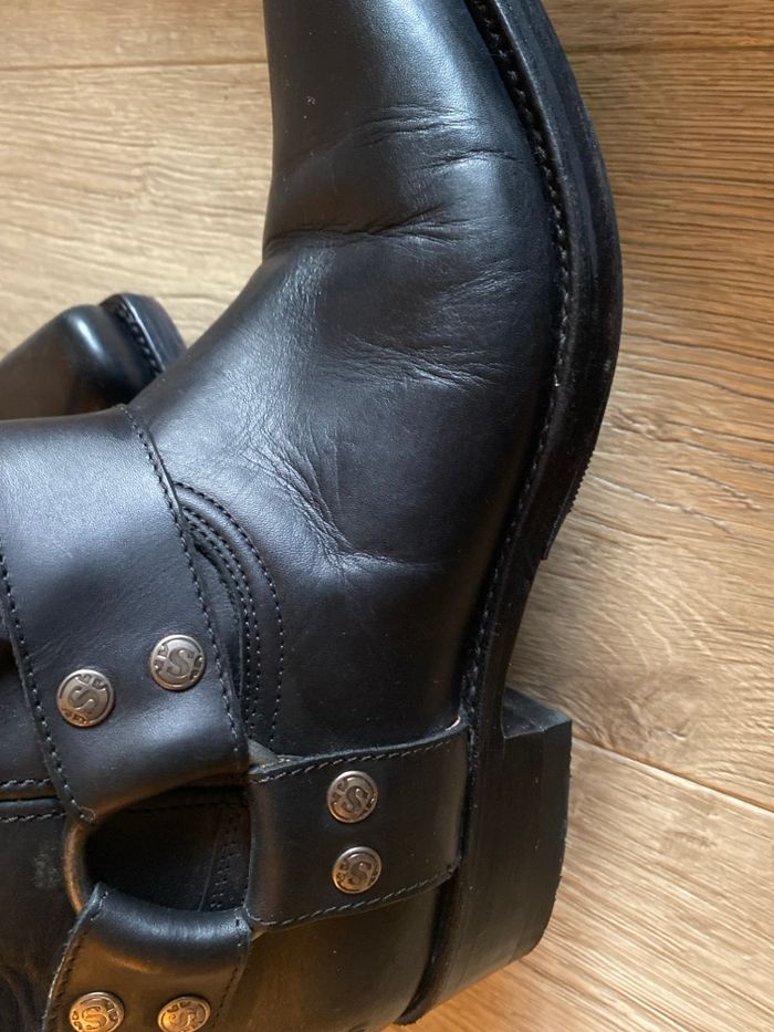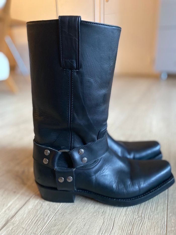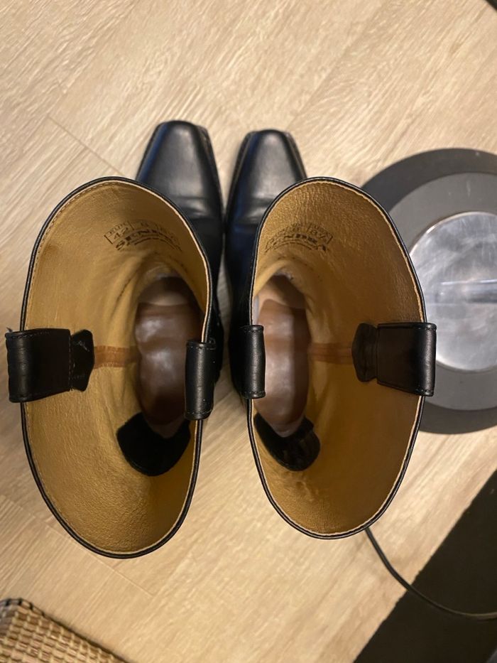 Santiags homme en cuir épais noir, très peu portées, en très bon état. Cuir intérieur impeccable, semelle aussi. Pointure 42, hauteur talon 3 cm, hauteur botte 33 cm, tour de cheville 35 cm, tour de mollet 38 cm. Léger accroc photo 9