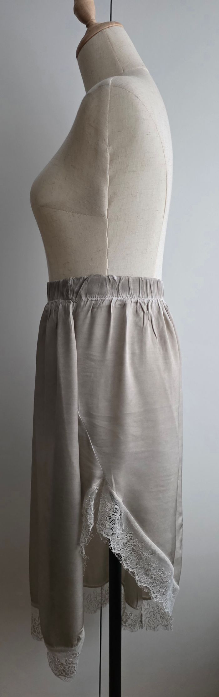 Jupe asymétrique taille 36, 55% viscose, 45% soie. Taille élastique, couleur gris chiné, dentelle. Longueur: 73cm