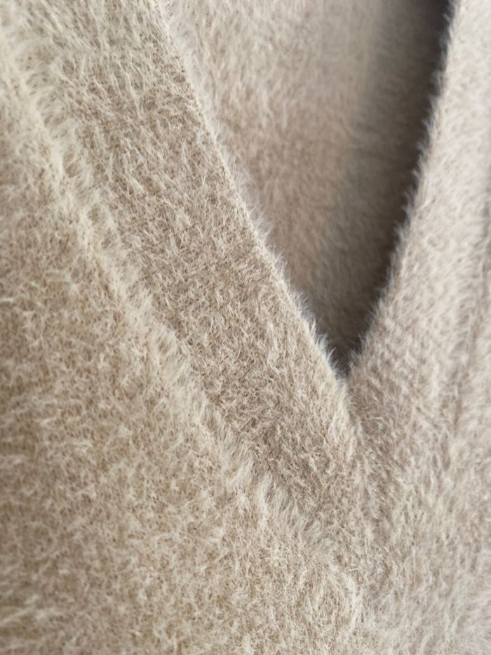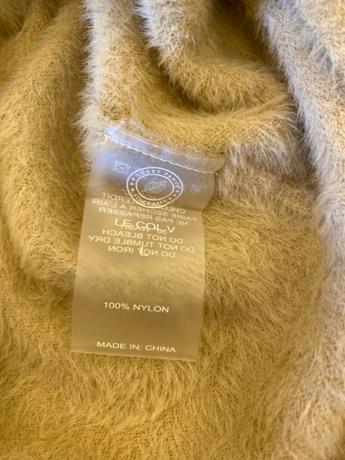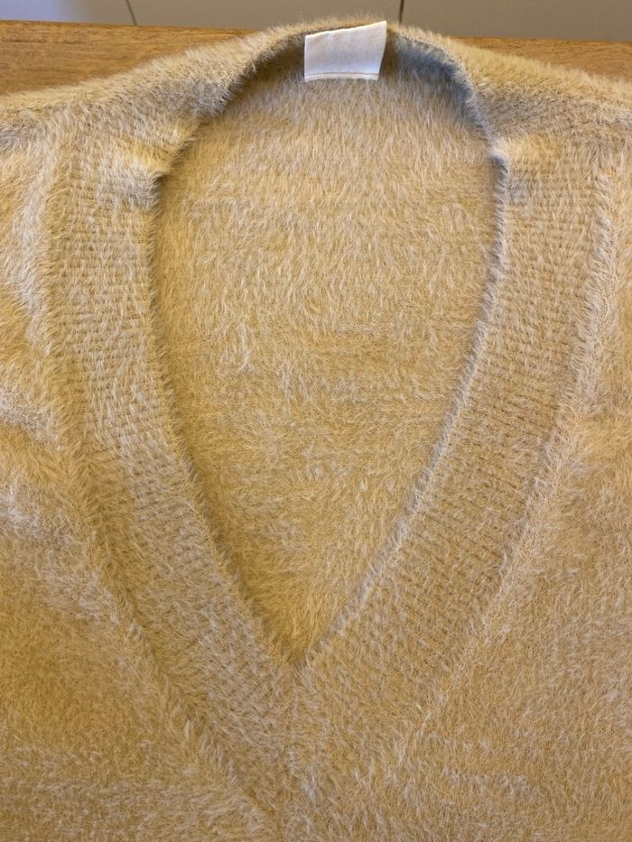 Pull long taille L, effet robe pour 1.65 m, marque Sweet Pants, d'un joli beige, neuf jamais porté. Encolure V prononcée. Longueur pull 71 cm, largeur 60 cm, emmanchures tombantes, longueur manches 56 cm. Matière ultra douce, petite peluche, très confort