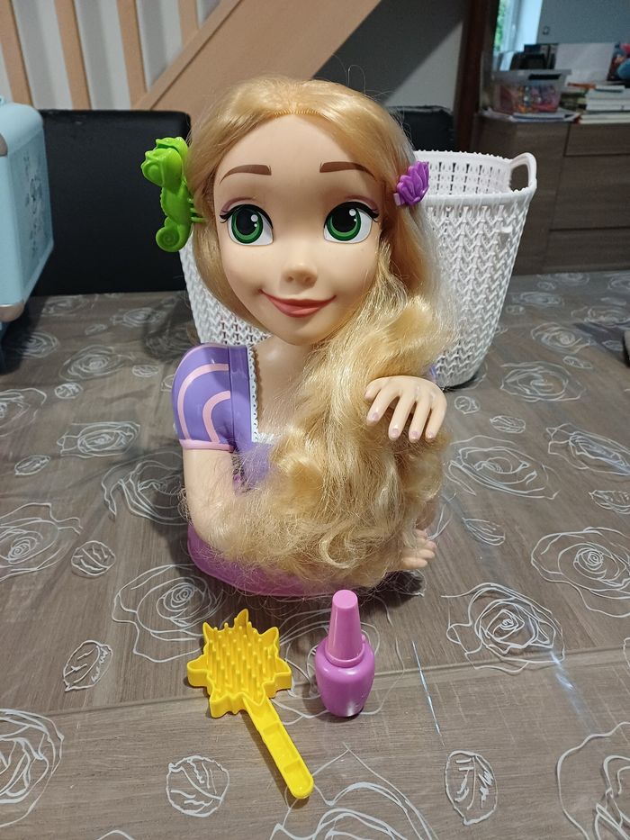 Tête à coiffer Raiponce avec ses accessoires (barette Pascal, barette violette, brosse soleil et faux vernis). Très bon état général, les cheveux sont à brosser pour éviter les nœuds évidemment. Très peu servi