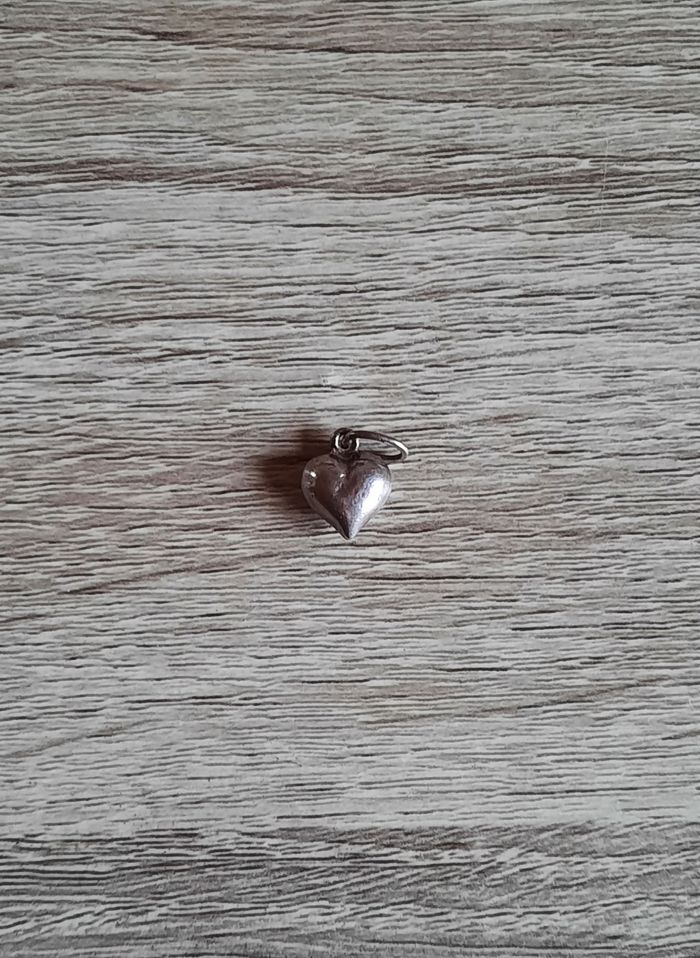Joli pendentif en métal argenté en forme de cœur. Matière : Métal argenté Dimension : 1 cm x 1 cm Bon état