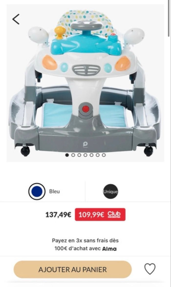 Très bon état Presque jamais utilisé, car mon fils va cinq minutes dedans et il veut ressortir Le seul petit problème, c'est qu'ils m'ont donné deux rétros gauche au lieu d'un gauche et d'un droit mais n'empêche pas l'utilisation Payer en neuf avec la carte orchestra 109,99€ Prix de la revente 70€ À utiliser quand bébé veut se mettre debout, mais n'y arrive pas encore tout seul Merci de choisir Chronopost car sinon le colis ne passera pas