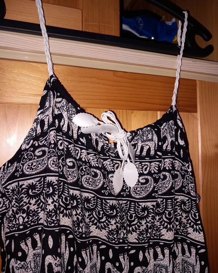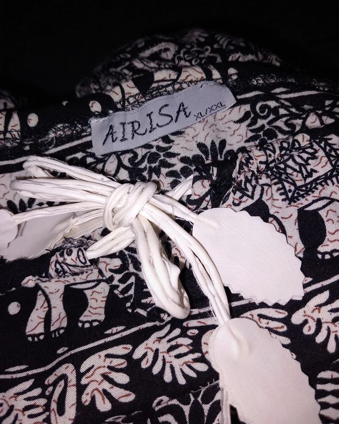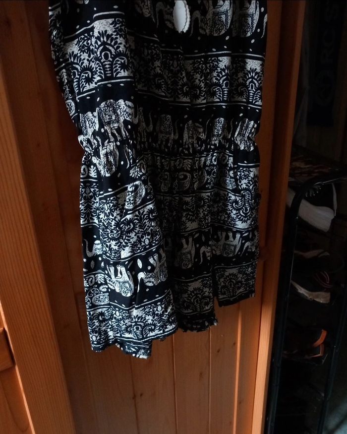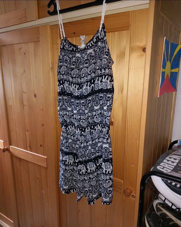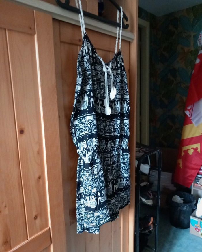 Combinaison short Airisa noire ornée de motifs blanc cassé représentant des éléphants et des arabesques. Cette pièce originale est parfaite pour vos journées décontractées ou vos sorties estivales ! 👚 Détails : - Style unique avec des motifs qui attirent l’attention - Confortable et légère, idéale pour les journées chaudes - Parfaite pour traîner à la maison ou sortir avec des amis - État : Portée une ou deux fois, en bon état !
