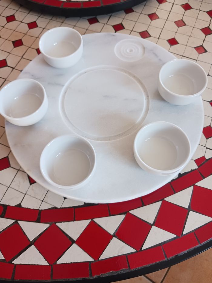 Plateau tournant en marbre pour service fondue contenant 5 ramequins pour les sauces ( 1manque).