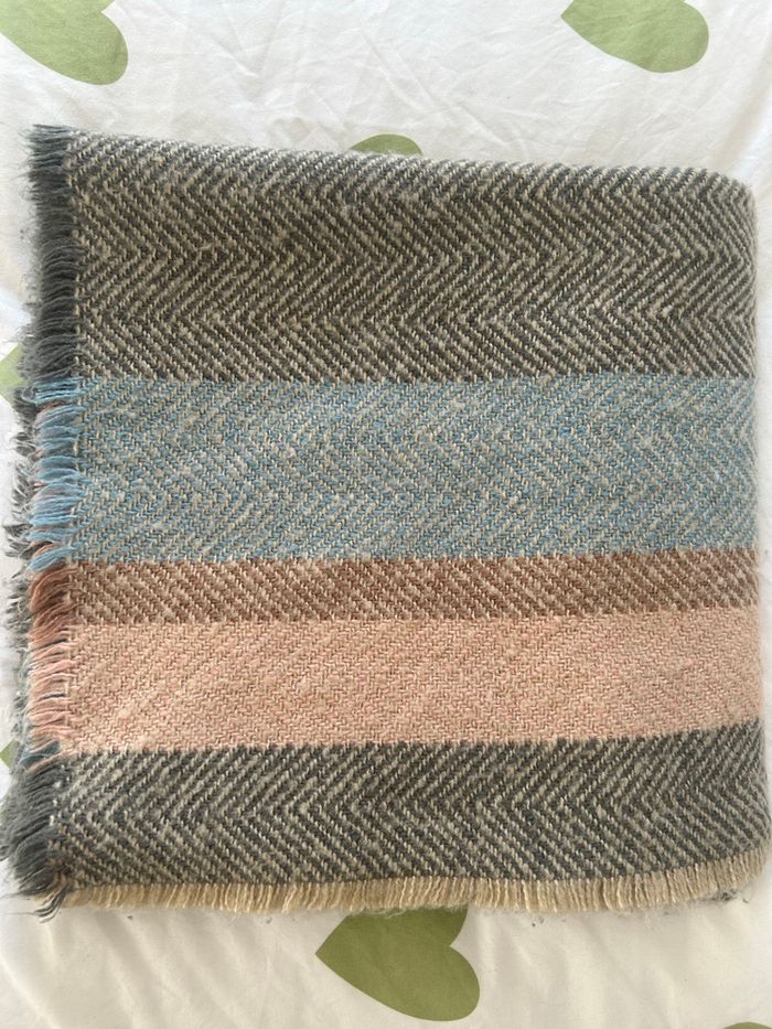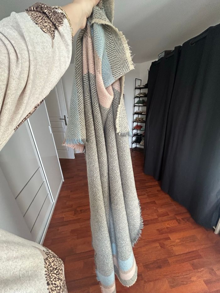 écharpe vintage à bandes rose,bleu ciel,marron clair et grise ✨ très malléable,vous pouvez lui donner le style que vous souhaitez grâce à sa longueur,assez épaisse pour tenir bien chaud également 🪻 la matière est très douce 💗