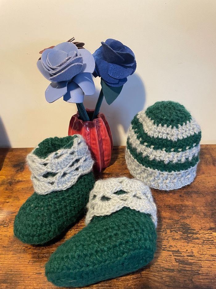 ✨Ensemble bonnet et chaussons 6 mois✨ De couleur hivernale pour une idée cadeau ou pour son bout de chou originale et unique Mélange de coton et de laine ( de quoi tenir au chaud)