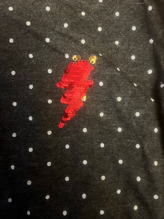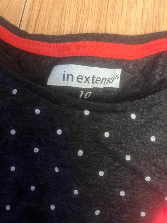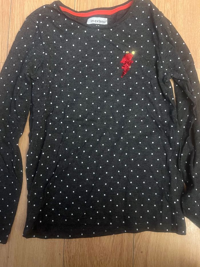 Je vends ce t-shirt enfant noir à pois blancs avec un petit motif en sequins rouges. - Type de produit : T-shirt - Marque : In Extenso - Taille : 10 ans / 140 cm - Couleur : Noir - Motif : Pois blancs, Sequins rouges N’hésitez pas à consulter ma vitrine, il y a une réduction de lot envoie rapide assuré