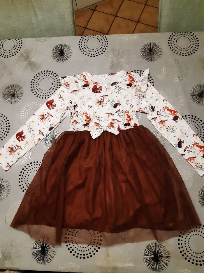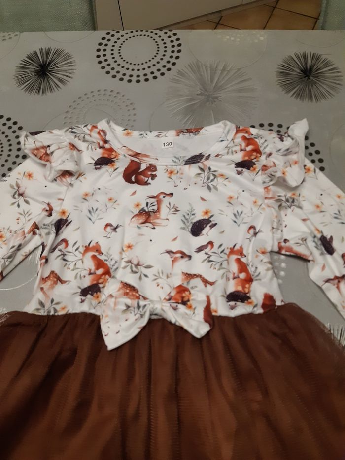 Bonjour 🖐 Robe fille taille 8 ans à manches longues, avec haut blanc imprimé motif forêt (animaux et feuillage) et jupe en tulle marron. Coupe confortable et élégante, idéale pour l’automne/hiver ou une occasion spéciale. Robe neuve jamais portée
