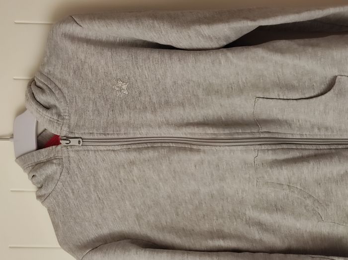 "Jolie veste à capuche zippée pour fille, taille 8 ans (étiquette indiquant 10 ans). Coloris gris et corail, avec motif étoile sur la poitrine. Poches pratiques sur le devant, idéale pour garder les mains au chaud ou ranger de petits objets. Très bon état"