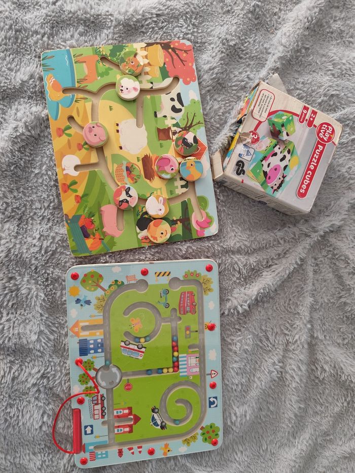 Lot de 3 jeux en bois idéal des 18 mois jusqu'à 3 ans le lot se compose d'un jeu de cube en bois puzzle (possibilité de faire 6 puzzle différents avec les cubes) // 1 jeu motricité aimant avec un stylet aimanté il faut faire le parcours labyrinthe aux petites billes . Et ensuite un autre jeu en bois où il faut replacer les tetes d'animaux sur les bons corps (l'enfant doit poussé les têtes en bois dans le labyrinthe)