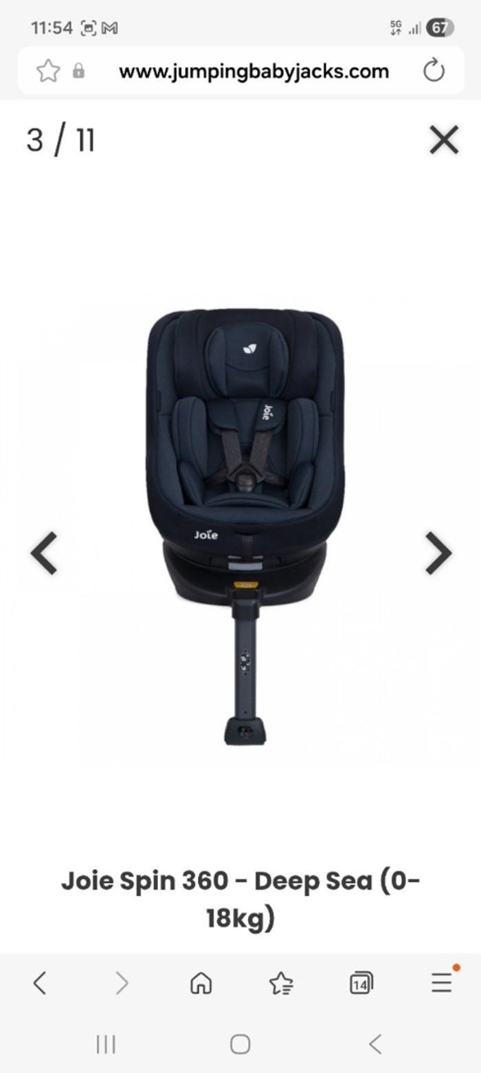 Vends un siège auto de marque JOIE modèle SPIN 360, bleu foncé, NEUF AVEC ETIQUETTE (mais carton ouvert), évolutif (de la naissance à 4 ans). Fixations Isofix. Siège évolutif, inclinable en 5 positions et pivotable à 360 degrés. Prix : 100€ ( prix d'achat : 319€). Caractéristiques : *Siège auto groupe 0+/1 *Utilisable dos à la route de la naissance à 18 kg (4 ans environ) *Utilisable face à la route de 9 à 18 kg (1-4 ans environ) *Pivotant à 360° grâce à une poignée utilisable d'une seule main *Design compact pour s'installer dans toutes les voitures même les plus petites 5 positions d'inclinaison dos ou face à la route *6 positions de la têtière réglable d'une seule main pour suivre la croissance de l'enfant *Harnais qui se règle automatiquement avec la hauteur de la têtière *Insert souple en 3 parties pour s'adapter à chaque étape de la croissance des tout-petits *Structure respirante *Tissus doux et de qualité offrant un confort optimal *Voyants de couleur pour valider l'installation *Harnais 5 points avec protections molletonnées qui garde bébé en sécurité tout en douceur *Languette de réglage du harnais facile à utiliser Caractéristiques techniques : Dimensions : l44 cm x L24 cm x H64,8 cm (sans tenir compte de la base) Poids : 12 kg Utilisation : Groupe 0+/1, de la naissance à 18 kg