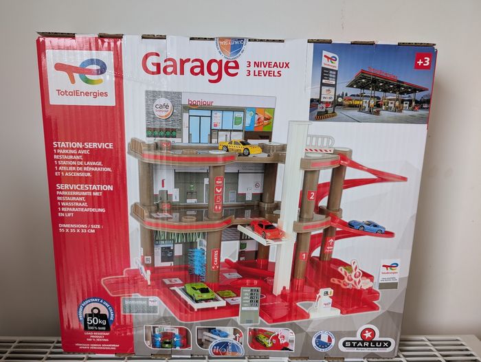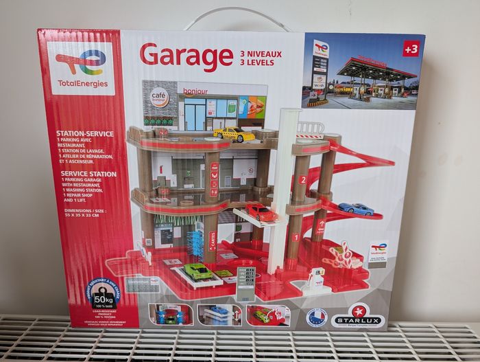 Garage Station Service 3 niveaux Total Energie neuf, scellé par étiquette d'origine voir photo Pour les enfants de 3 ans et plus Dimension : 55 x 35 x 33 cm Véhicules vendus séparément Boîte abîmée d'origine