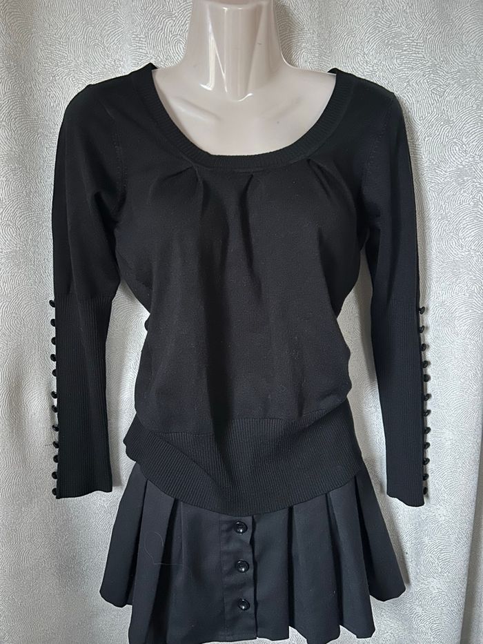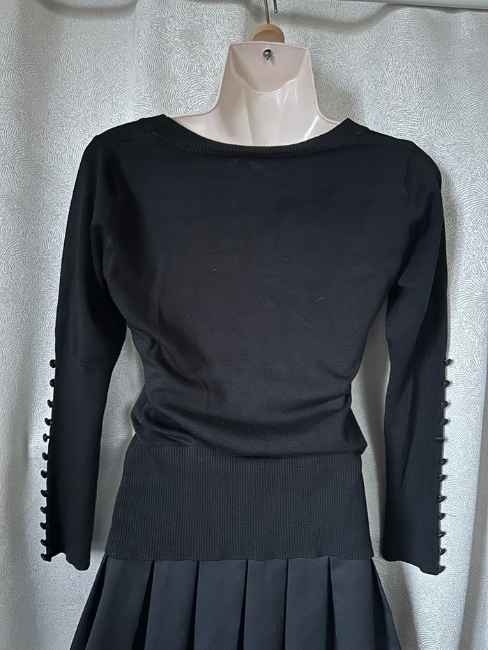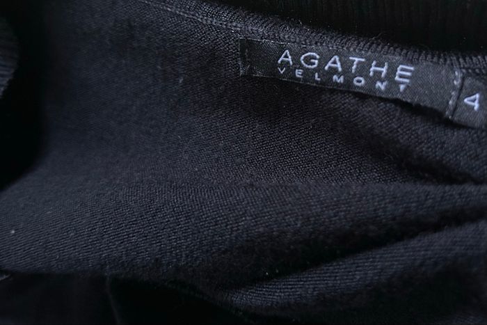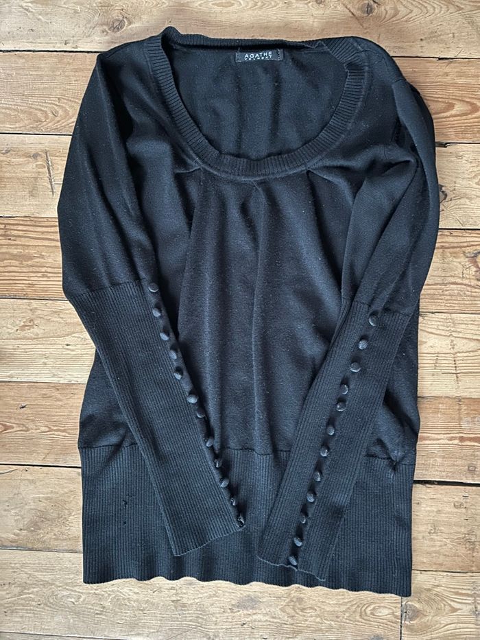 Pull fin noir boutons sur les manches Taille 4 , très bien jusqu’au 42 83% acrylique 17% polyamide Agathe Velmont Carrure 34,5 cm Aisselle à aisselle 42,5 cm Longueur 62 cm