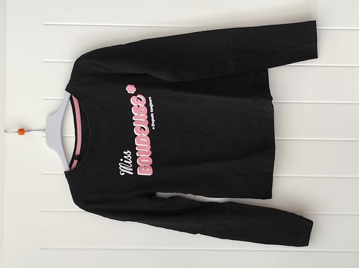 "T-shirt manches longues ML pour enfant. Taille étiquette : 10 ans, mais correspond plutôt à un 8 ans. Coloris : noir avec motif texte rose. Très bon état, comme neuf. Parfait pour compléter une tenue casual ou décontractée. État : Très bon état"