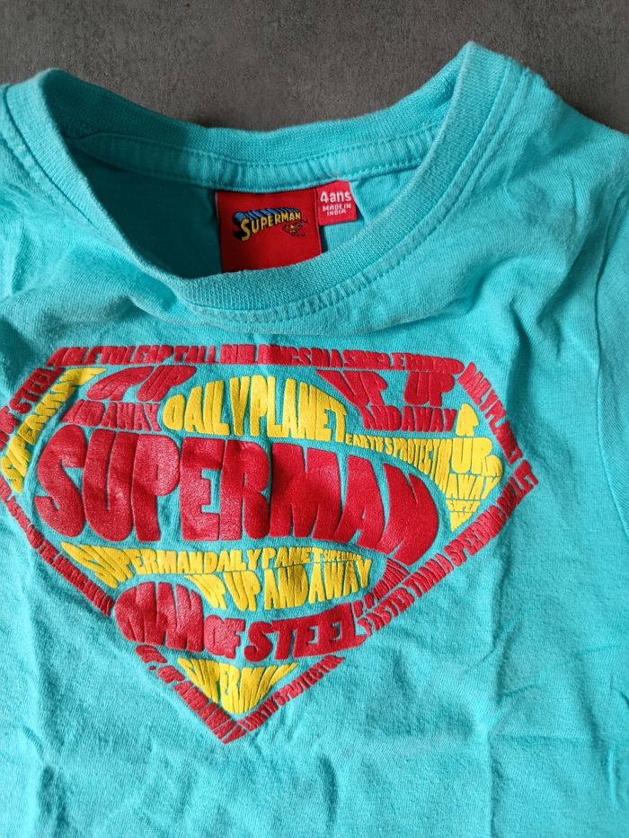 Tee-shirt Superman manches courtes Taille 4 ans Marque Superman Très bon état (petit accroc sur le côté cf dernière photo) N'hésitez pas à regarder mon dressing, des réductions à la clé en faisant des lots