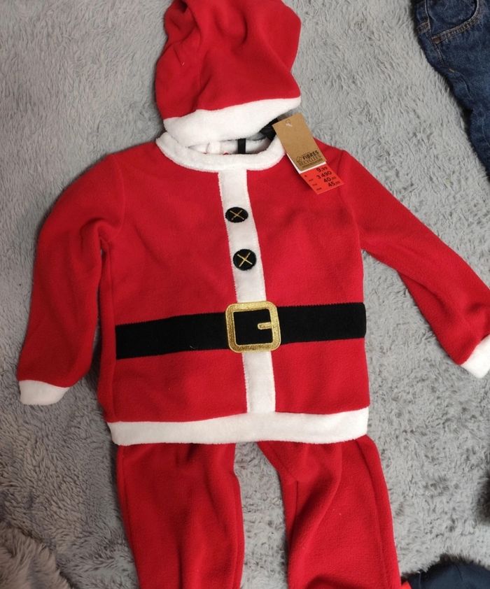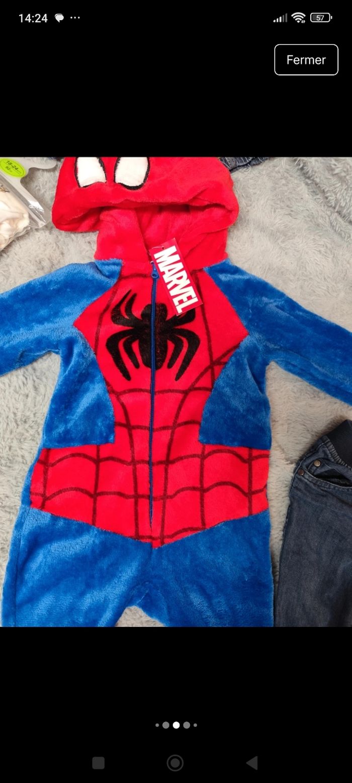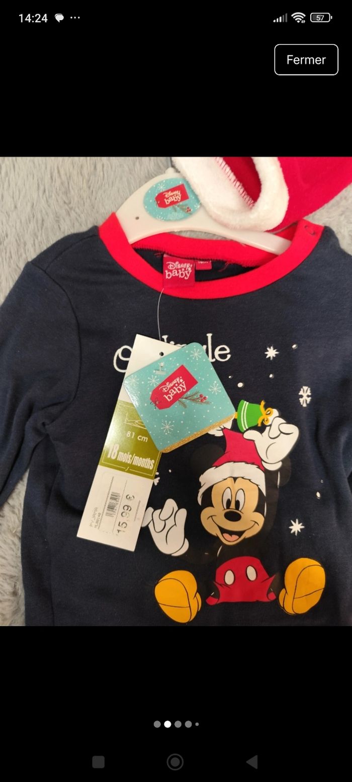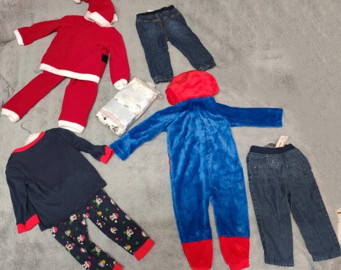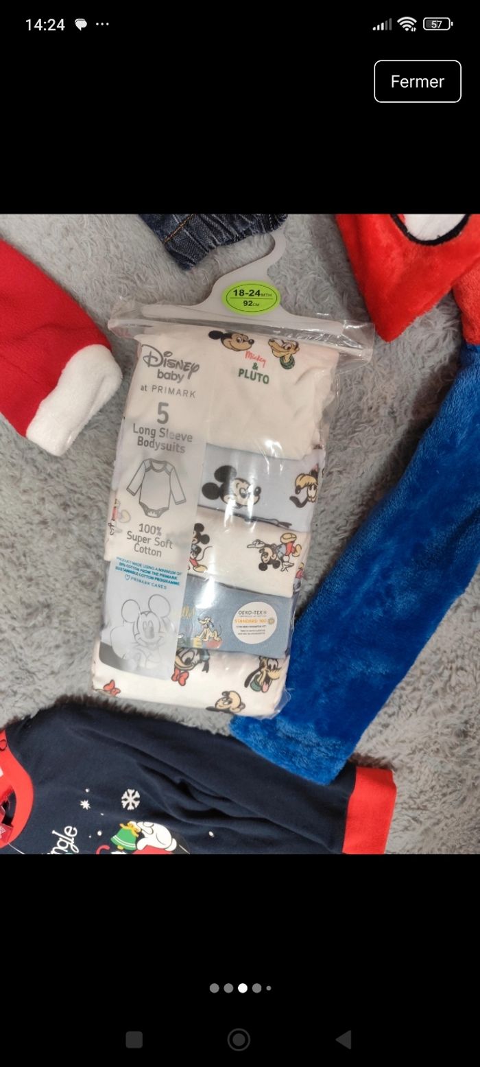 Lot vêtement neuf 18 mois composé : d'un lot de bodies 5 bodis body manche longues disney Mickey taille 18-24mois // d'un pyjama ou sur-pyjama polaire spiderman 18mois // d'un pyjama mickey Noël 18 mois // d'un pyjama père noël 18 mois // de 2 jeans 18 mois : 1 kiabi et 1 orchestra // un body manche courte Olympique de Marseille OM 18 mois
