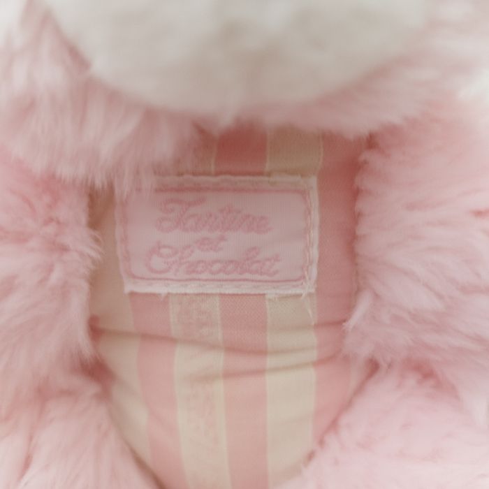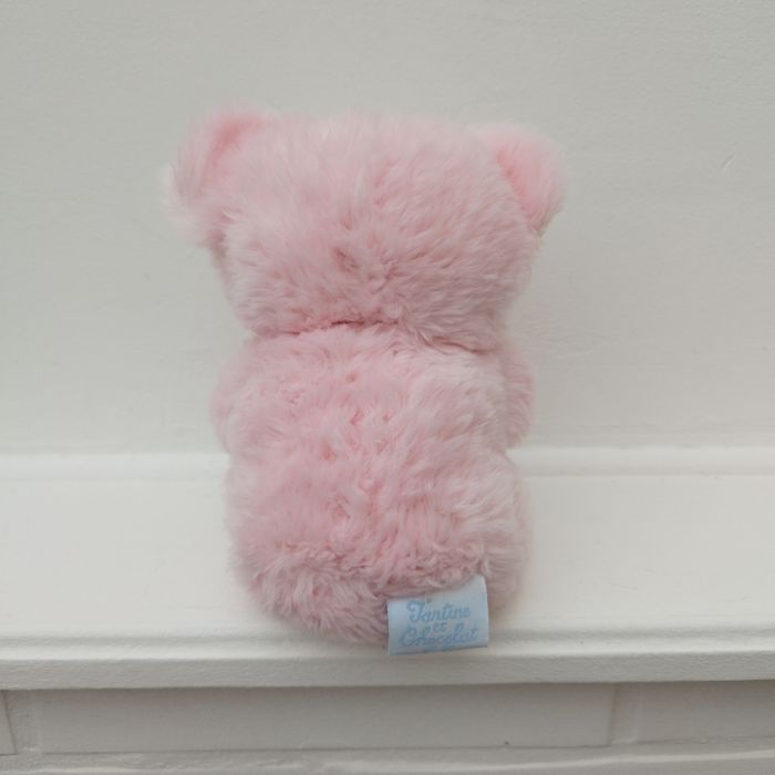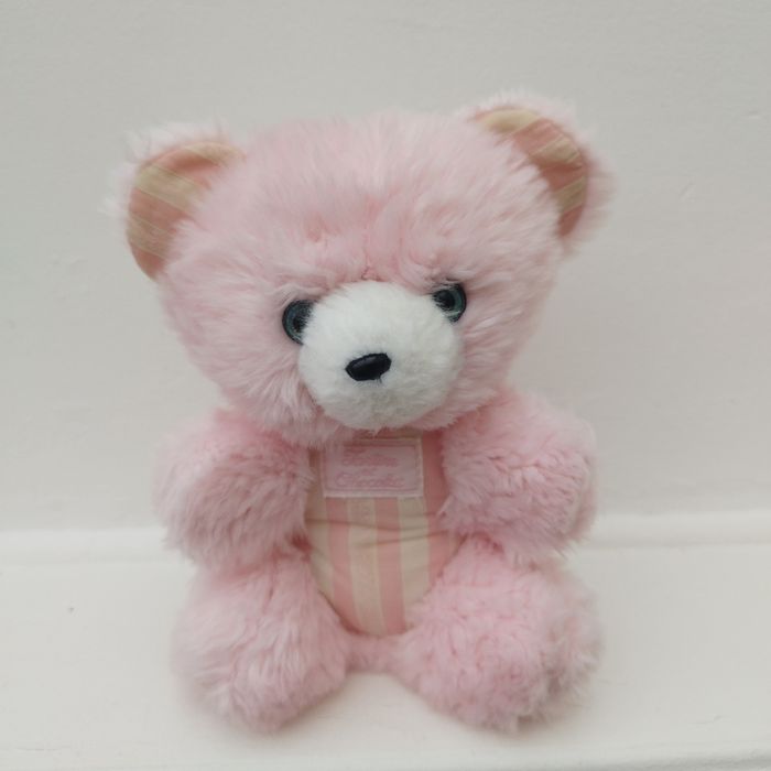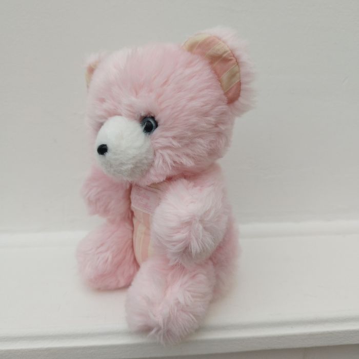 Ourson rose hochet asis avec tissus rayé. Environ 17 cm.