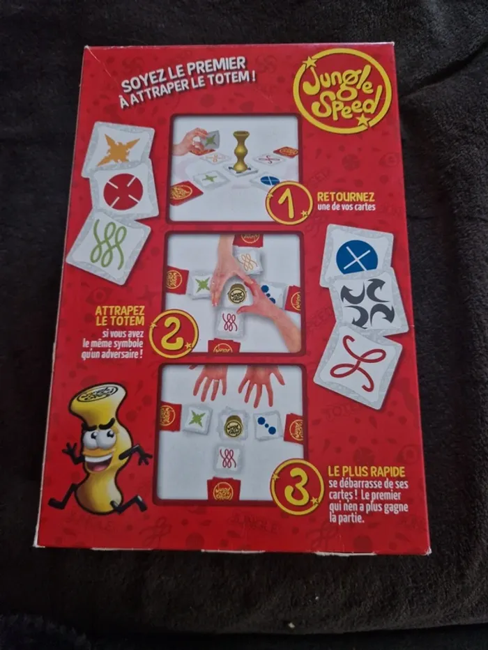 Vend jeu de société Jungle Speed En bon état Juste la boîte un peut usé sur les coins et un carte un petit peu abîmée voir photo Pour plus de renseignements ou photo je reste à votre disposition Prix négociable dans la limite du raisonnable