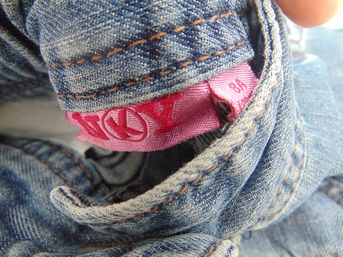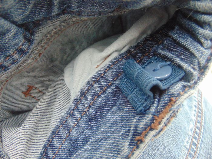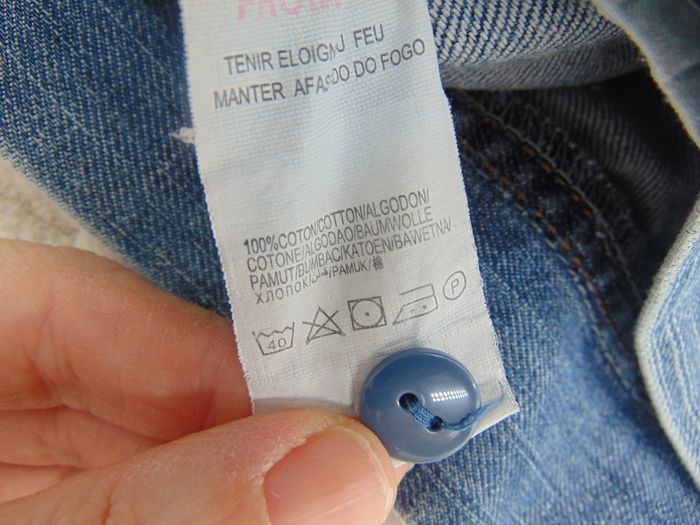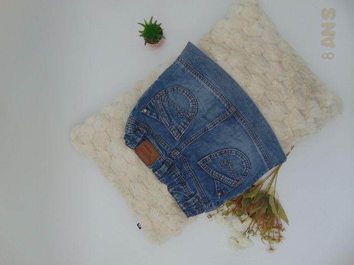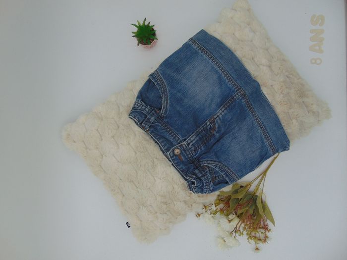 - Courte - Matière jeans - Taille ajustable - Fermeture avec un bouton - Couleur bleue - Aucune tâche ni trou