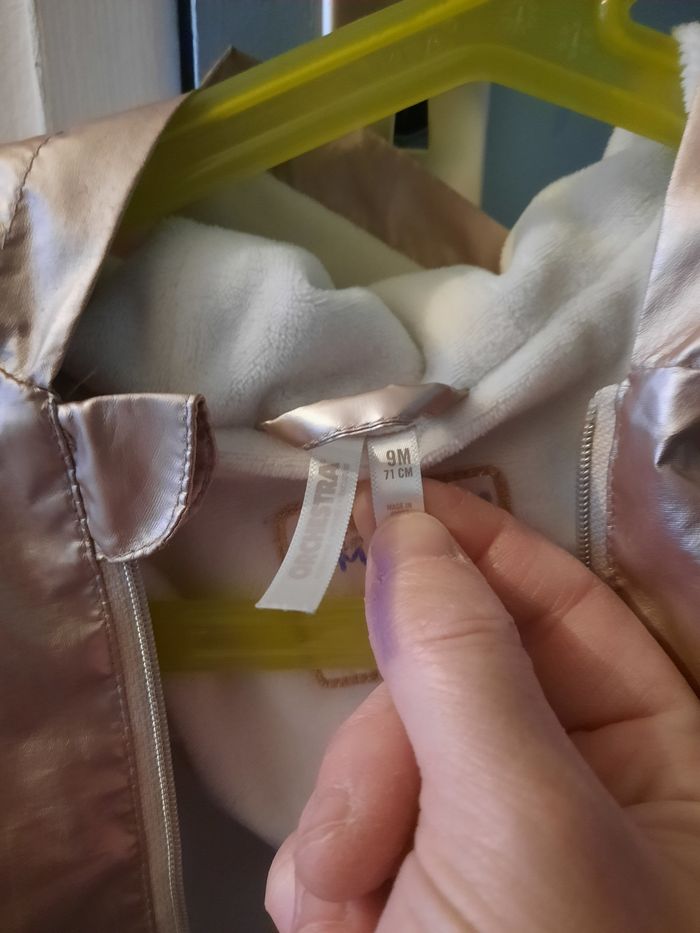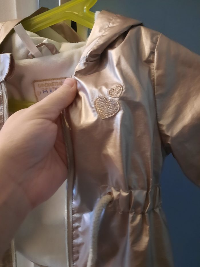 Veste bébé fille couleur nude beige et doré motif cœur Marque orchestra taille 9mois (71cm) elle est polaire à l'intérieur Parfait état Initiale sur l'intérieur mais ne gêne en rien à son utilisation