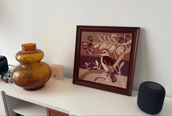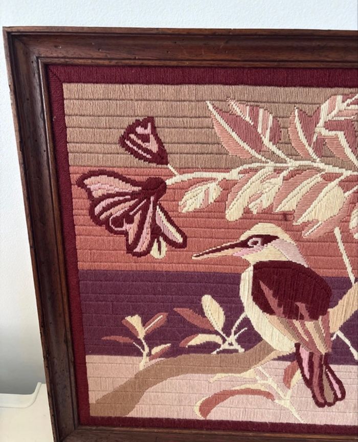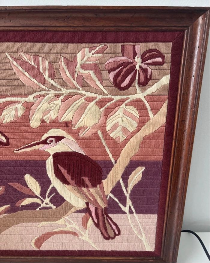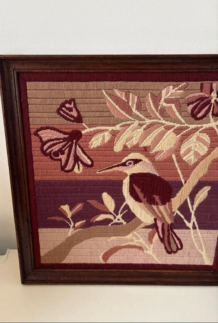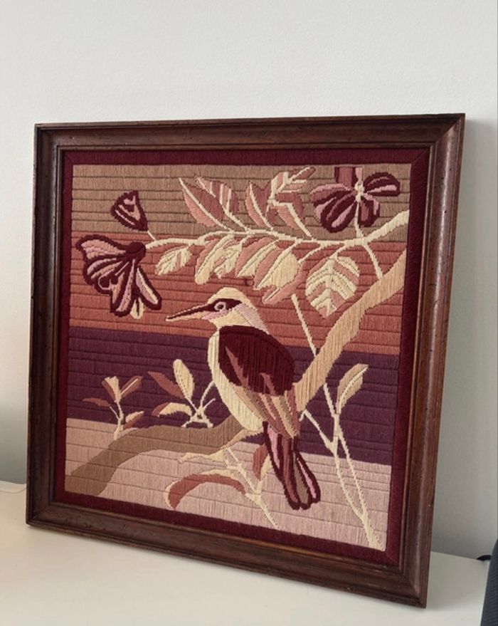 Canevas vintage année 70 - ton vieux rose - oiseau sur branche - très bon état 📏 Dimensions : 48,5 cm x 49,5 cm 🎨 Couleurs douces et chaleureuses 🕰️ Style vintage authentique 📦 Envoi soigné – photos supplémentaires sur demande