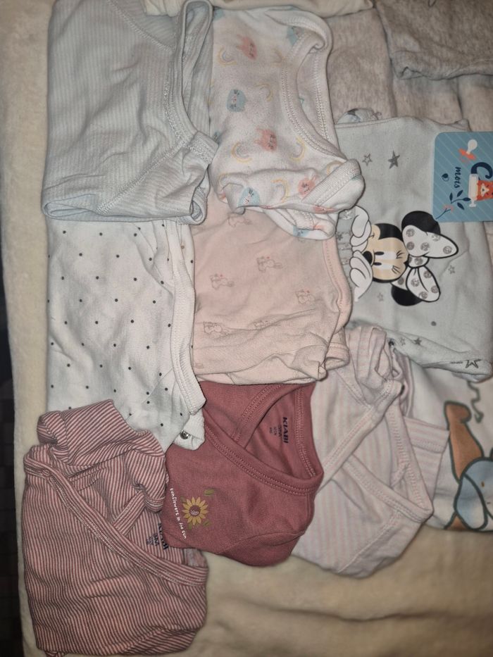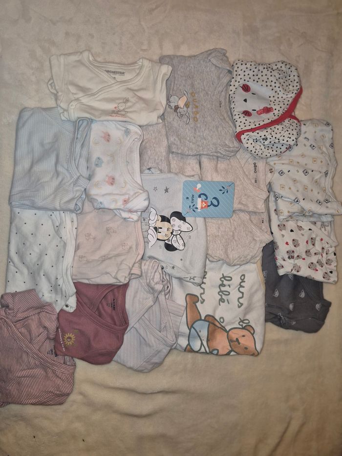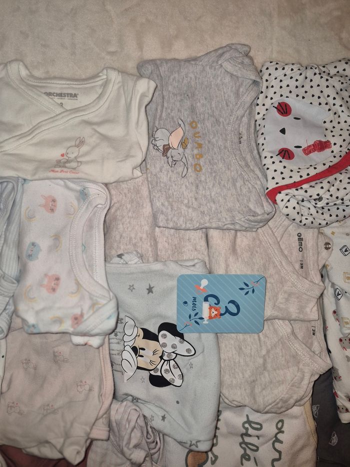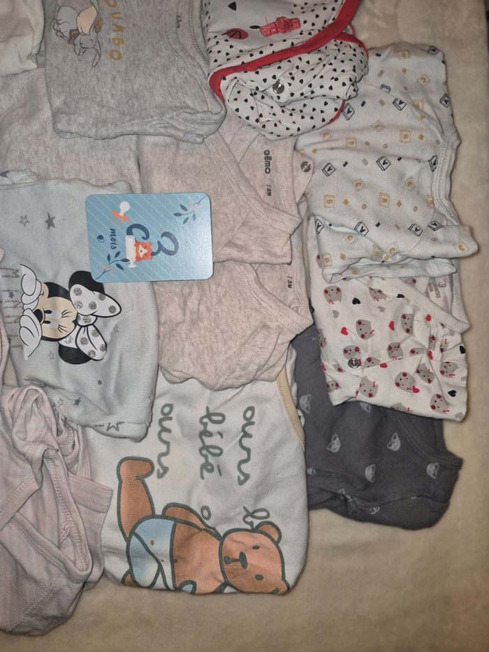 👶 Taille : 3 mois 📦 Contenu : 18 bodies manche longue 🌸 État : bon état 🏠 Maison non-fumeur 🧼 Propres, lavés Aucun trou, aucune tache, fermetures en parfait état.
