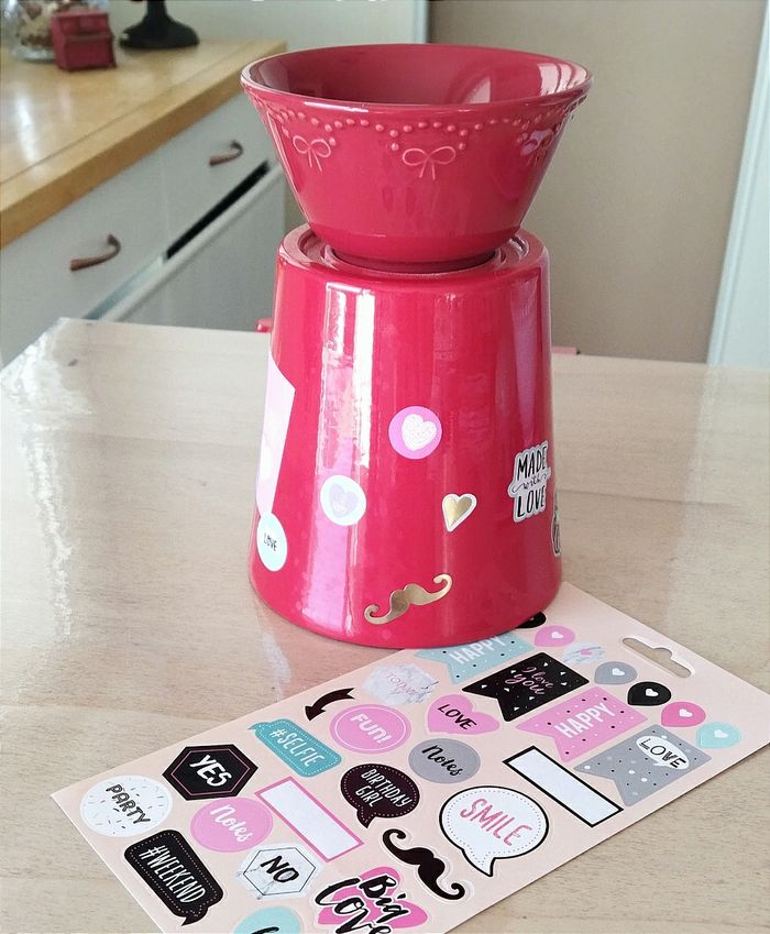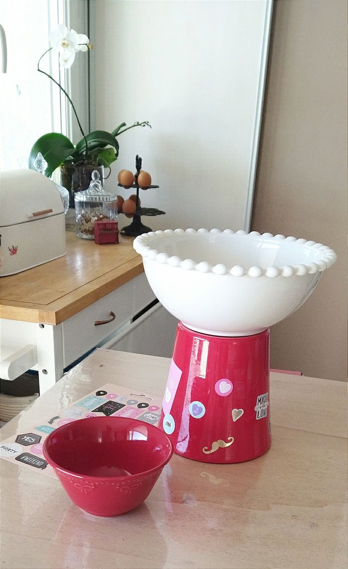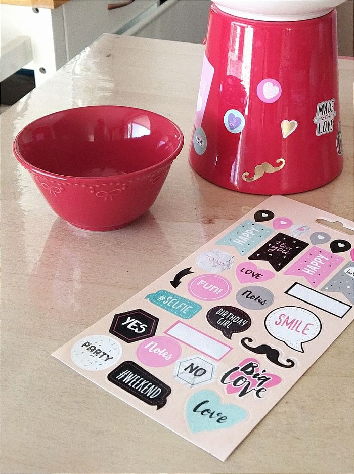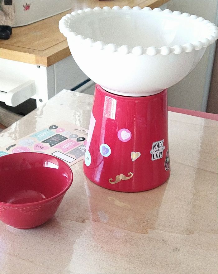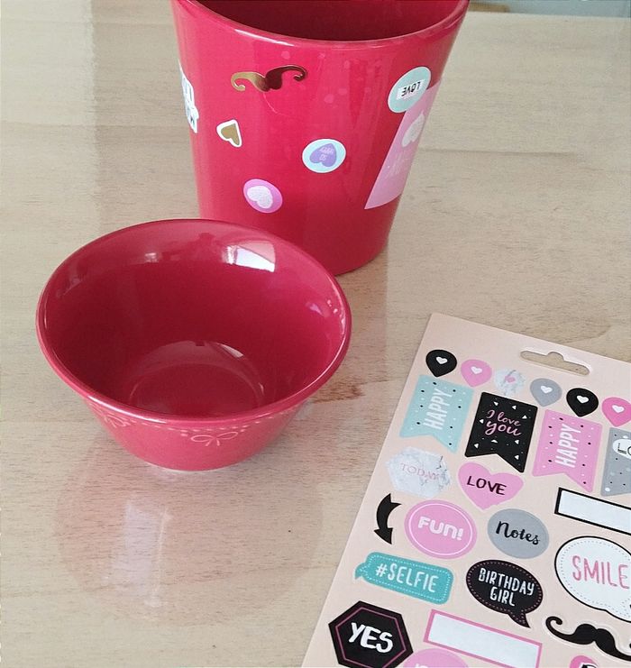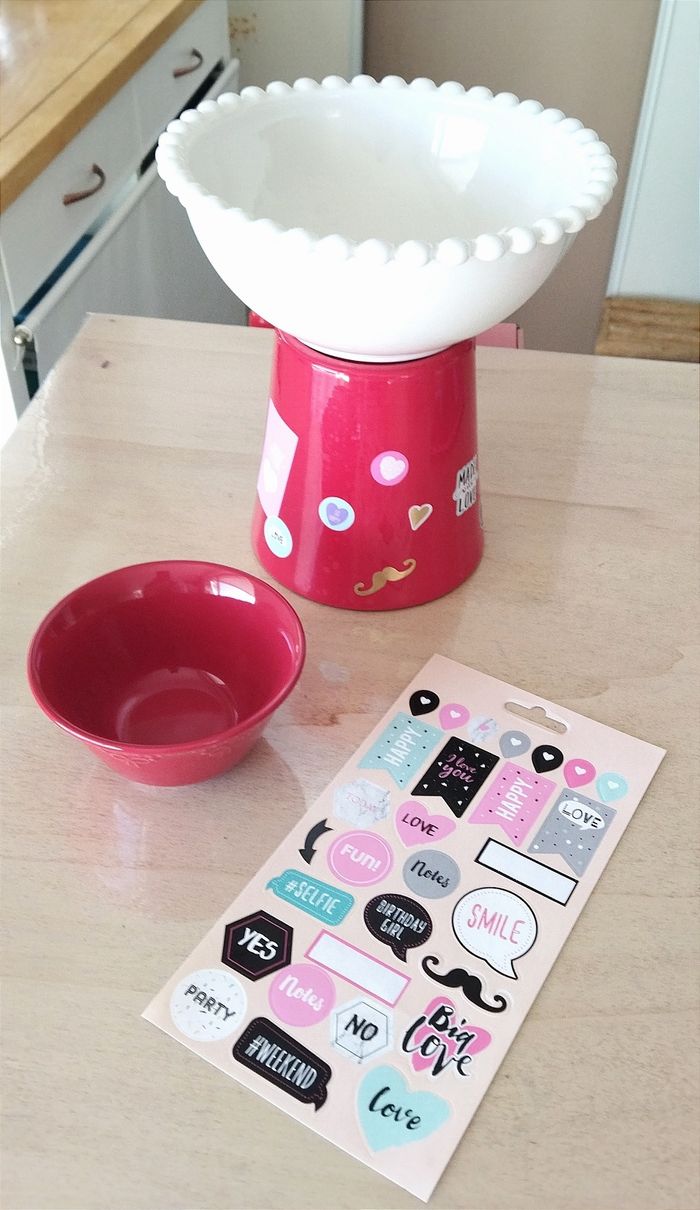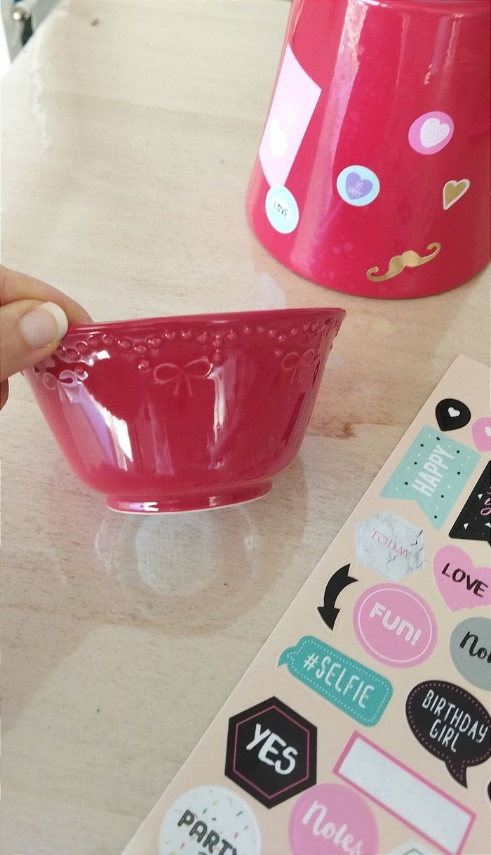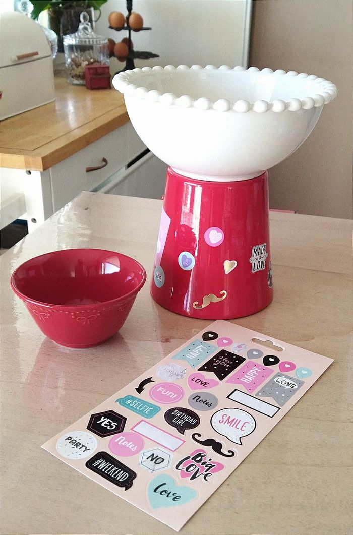 Lot rouge. 1 bol en céramique et un cache pot. + Une planche d'autocollants Idéal pour Noël ou St Valentin à mettre sur la table pour servir des gressins avec sa sauce.