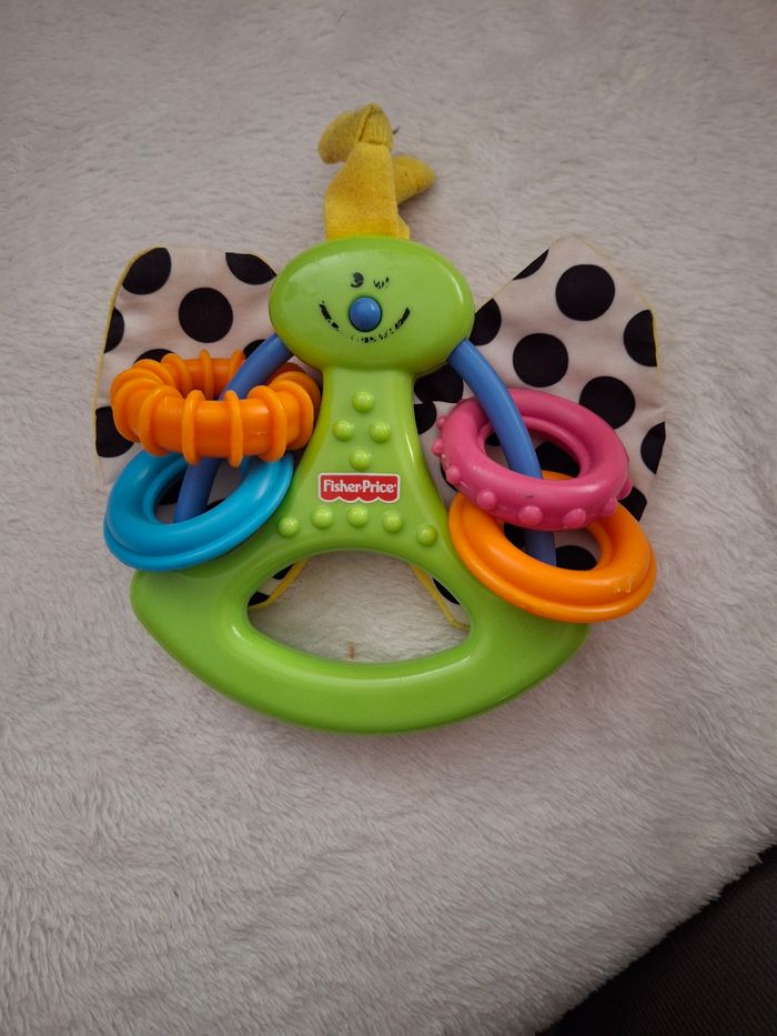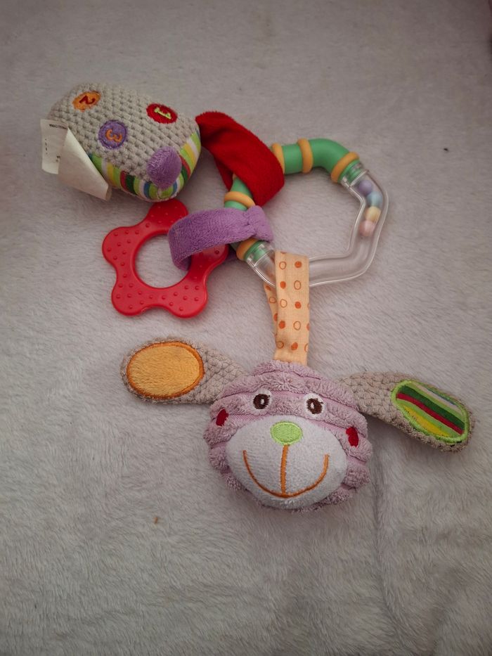 Je vends ce lot de jouets d'éveil pour bébé. - Type de produit : Jouets d'éveil - Âge recommandé : De 0 à 1 an - Composition du lot : Hochet, anneau de dentition, peluche, jouets sonores et interactifs - Matière : Plastique, tissu, peluche Bon état. N'hésitez pas à me contacter pour plus d'informations sur ce lot de jouets pour bébé.